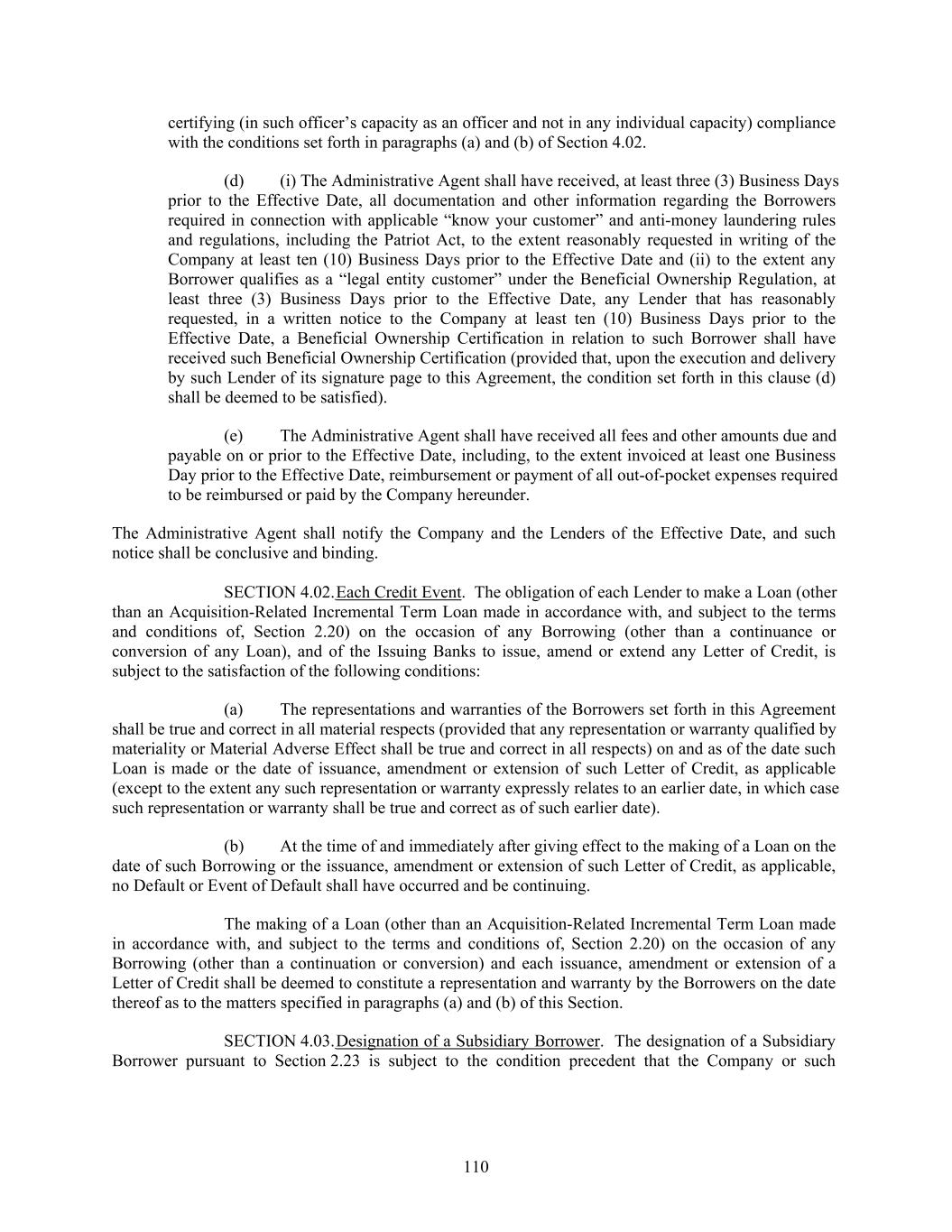 certifying (in such officer’s capacity as an officer and not in any individual capacity) compliance with the conditions set forth in paragraphs (a) and (b) of Section 4.02. (d) (i) The Administrative Agent shall have received, at least three (3) Business Days prior to the Effective Date, all documentation and other information regarding the Borrowers required in connection with applicable “know your customer” and anti-money laundering rules and regulations, including the Patriot Act, to the extent reasonably requested in writing of the Company at least ten (10) Business Days prior to the Effective Date and (ii) to the extent any Borrower qualifies as a “legal entity customer” under the Beneficial Ownership Regulation, at least three (3) Business Days prior to the Effective Date, any Lender that has reasonably requested, in a written notice to the Company at least ten (10) Business Days prior to the Effective Date, a Beneficial Ownership Certification in relation to such Borrower shall have received such Beneficial Ownership Certification (provided that, upon the execution and delivery by such Lender of its signature page to this Agreement, the condition set forth in this clause (d) shall be deemed to be satisfied). (e) The Administrative Agent shall have received all fees and other amounts due and payable on or prior to the Effective Date, including, to the extent invoiced at least one Business Day prior to the Effective Date, reimbursement or payment of all out-of-pocket expenses required to be reimbursed or paid by the Company hereunder. The Administrative Agent shall notify the Company and the Lenders of the Effective Date, and such notice shall be conclusive and binding. SECTION 4.02.Each Credit Event. The obligation of each Lender to make a Loan (other than an Acquisition-Related Incremental Term Loan made in accordance with, and subject to the terms and conditions of, Section 2.20) on the occasion of any Borrowing (other than a continuance or conversion of any Loan), and of the Issuing Banks to issue, amend or extend any Letter of Credit, is subject to the satisfaction of the following conditions: (a) The representations and warranties of the Borrowers set forth in this Agreement shall be true and correct in all material respects (provided that any representation or warranty qualified by materiality or Material Adverse Effect shall be true and correct in all respects) on and as of the date such Loan is made or the date of issuance, amendment or extension of such Letter of Credit, as applicable (except to the extent any such representation or warranty expressly relates to an earlier date, in which case such representation or warranty shall be true and correct as of such earlier date). (b) At the time of and immediately after giving effect to the making of a Loan on the date of such Borrowing or the issuance, amendment or extension of such Letter of Credit, as applicable, no Default or Event of Default shall have occurred and be continuing. The making of a Loan (other than an Acquisition-Related Incremental Term Loan made in accordance with, and subject to the terms and conditions of, Section 2.20) on the occasion of any Borrowing (other than a continuation or conversion) and each issuance, amendment or extension of a Letter of Credit shall be deemed to constitute a representation and warranty by the Borrowers on the date thereof as to the matters specified in paragraphs (a) and (b) of this Section. SECTION 4.03.Designation of a Subsidiary Borrower. The designation of a Subsidiary Borrower pursuant to Section 2.23 is subject to the condition precedent that the Company or such 110