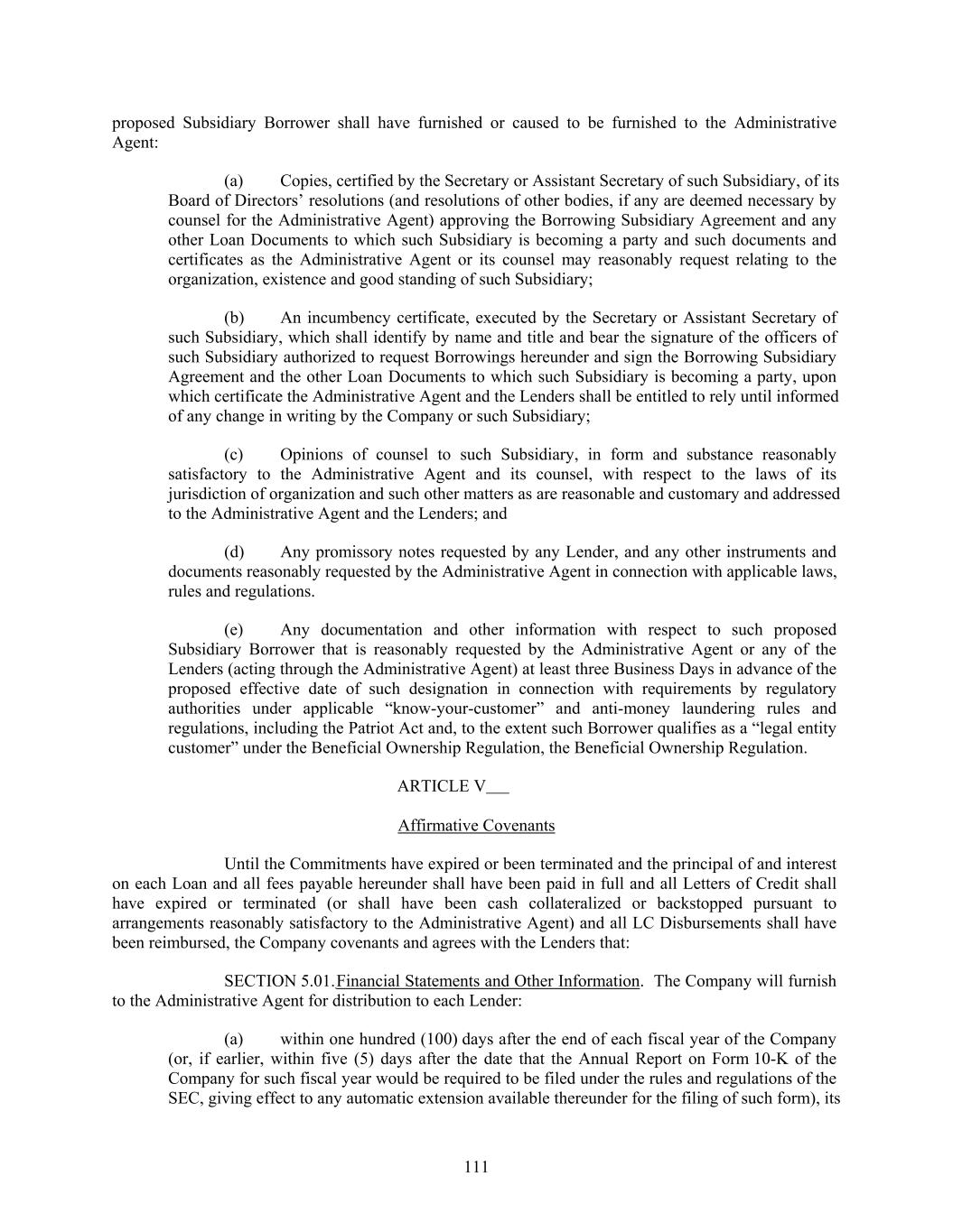 proposed Subsidiary Borrower shall have furnished or caused to be furnished to the Administrative Agent: (a) Copies, certified by the Secretary or Assistant Secretary of such Subsidiary, of its Board of Directors’ resolutions (and resolutions of other bodies, if any are deemed necessary by counsel for the Administrative Agent) approving the Borrowing Subsidiary Agreement and any other Loan Documents to which such Subsidiary is becoming a party and such documents and certificates as the Administrative Agent or its counsel may reasonably request relating to the organization, existence and good standing of such Subsidiary; (b) An incumbency certificate, executed by the Secretary or Assistant Secretary of such Subsidiary, which shall identify by name and title and bear the signature of the officers of such Subsidiary authorized to request Borrowings hereunder and sign the Borrowing Subsidiary Agreement and the other Loan Documents to which such Subsidiary is becoming a party, upon which certificate the Administrative Agent and the Lenders shall be entitled to rely until informed of any change in writing by the Company or such Subsidiary; (c) Opinions of counsel to such Subsidiary, in form and substance reasonably satisfactory to the Administrative Agent and its counsel, with respect to the laws of its jurisdiction of organization and such other matters as are reasonable and customary and addressed to the Administrative Agent and the Lenders; and (d) Any promissory notes requested by any Lender, and any other instruments and documents reasonably requested by the Administrative Agent in connection with applicable laws, rules and regulations. (e) Any documentation and other information with respect to such proposed Subsidiary Borrower that is reasonably requested by the Administrative Agent or any of the Lenders (acting through the Administrative Agent) at least three Business Days in advance of the proposed effective date of such designation in connection with requirements by regulatory authorities under applicable “know-your-customer” and anti-money laundering rules and regulations, including the Patriot Act and, to the extent such Borrower qualifies as a “legal entity customer” under the Beneficial Ownership Regulation, the Beneficial Ownership Regulation. ARTICLE V Affirmative Covenants Until the Commitments have expired or been terminated and the principal of and interest on each Loan and all fees payable hereunder shall have been paid in full and all Letters of Credit shall have expired or terminated (or shall have been cash collateralized or backstopped pursuant to arrangements reasonably satisfactory to the Administrative Agent) and all LC Disbursements shall have been reimbursed, the Company covenants and agrees with the Lenders that: SECTION 5.01.Financial Statements and Other Information. The Company will furnish to the Administrative Agent for distribution to each Lender: (a) within one hundred (100) days after the end of each fiscal year of the Company (or, if earlier, within five (5) days after the date that the Annual Report on Form 10-K of the Company for such fiscal year would be required to be filed under the rules and regulations of the SEC, giving effect to any automatic extension available thereunder for the filing of such form), its 111