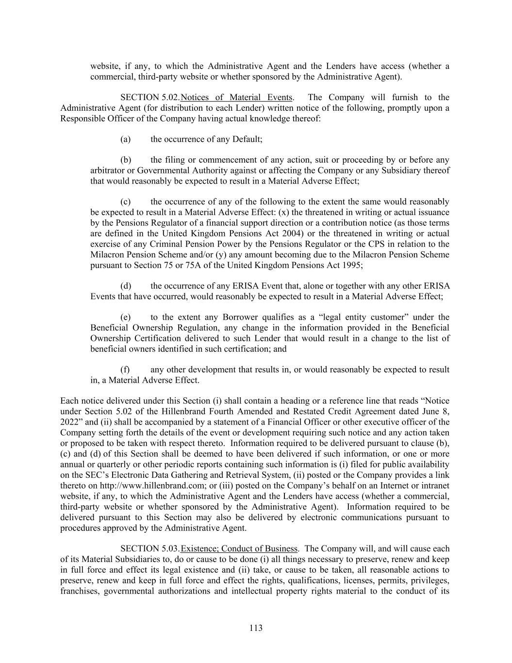 website, if any, to which the Administrative Agent and the Lenders have access (whether a commercial, third-party website or whether sponsored by the Administrative Agent). SECTION 5.02.Notices of Material Events. The Company will furnish to the Administrative Agent (for distribution to each Lender) written notice of the following, promptly upon a Responsible Officer of the Company having actual knowledge thereof: (a) the occurrence of any Default; (b) the filing or commencement of any action, suit or proceeding by or before any arbitrator or Governmental Authority against or affecting the Company or any Subsidiary thereof that would reasonably be expected to result in a Material Adverse Effect; (c) the occurrence of any of the following to the extent the same would reasonably be expected to result in a Material Adverse Effect: (x) the threatened in writing or actual issuance by the Pensions Regulator of a financial support direction or a contribution notice (as those terms are defined in the United Kingdom Pensions Act 2004) or the threatened in writing or actual exercise of any Criminal Pension Power by the Pensions Regulator or the CPS in relation to the Milacron Pension Scheme and/or (y) any amount becoming due to the Milacron Pension Scheme pursuant to Section 75 or 75A of the United Kingdom Pensions Act 1995; (d) the occurrence of any ERISA Event that, alone or together with any other ERISA Events that have occurred, would reasonably be expected to result in a Material Adverse Effect; (e) to the extent any Borrower qualifies as a “legal entity customer” under the Beneficial Ownership Regulation, any change in the information provided in the Beneficial Ownership Certification delivered to such Lender that would result in a change to the list of beneficial owners identified in such certification; and (f) any other development that results in, or would reasonably be expected to result in, a Material Adverse Effect. Each notice delivered under this Section (i) shall contain a heading or a reference line that reads “Notice under Section 5.02 of the Hillenbrand Fourth Amended and Restated Credit Agreement dated June 8, 2022” and (ii) shall be accompanied by a statement of a Financial Officer or other executive officer of the Company setting forth the details of the event or development requiring such notice and any action taken or proposed to be taken with respect thereto. Information required to be delivered pursuant to clause (b), (c) and (d) of this Section shall be deemed to have been delivered if such information, or one or more annual or quarterly or other periodic reports containing such information is (i) filed for public availability on the SEC’s Electronic Data Gathering and Retrieval System, (ii) posted or the Company provides a link thereto on http://www.hillenbrand.com; or (iii) posted on the Company’s behalf on an Internet or intranet website, if any, to which the Administrative Agent and the Lenders have access (whether a commercial, third-party website or whether sponsored by the Administrative Agent). Information required to be delivered pursuant to this Section may also be delivered by electronic communications pursuant to procedures approved by the Administrative Agent. SECTION 5.03.Existence; Conduct of Business. The Company will, and will cause each of its Material Subsidiaries to, do or cause to be done (i) all things necessary to preserve, renew and keep in full force and effect its legal existence and (ii) take, or cause to be taken, all reasonable actions to preserve, renew and keep in full force and effect the rights, qualifications, licenses, permits, privileges, franchises, governmental authorizations and intellectual property rights material to the conduct of its 113