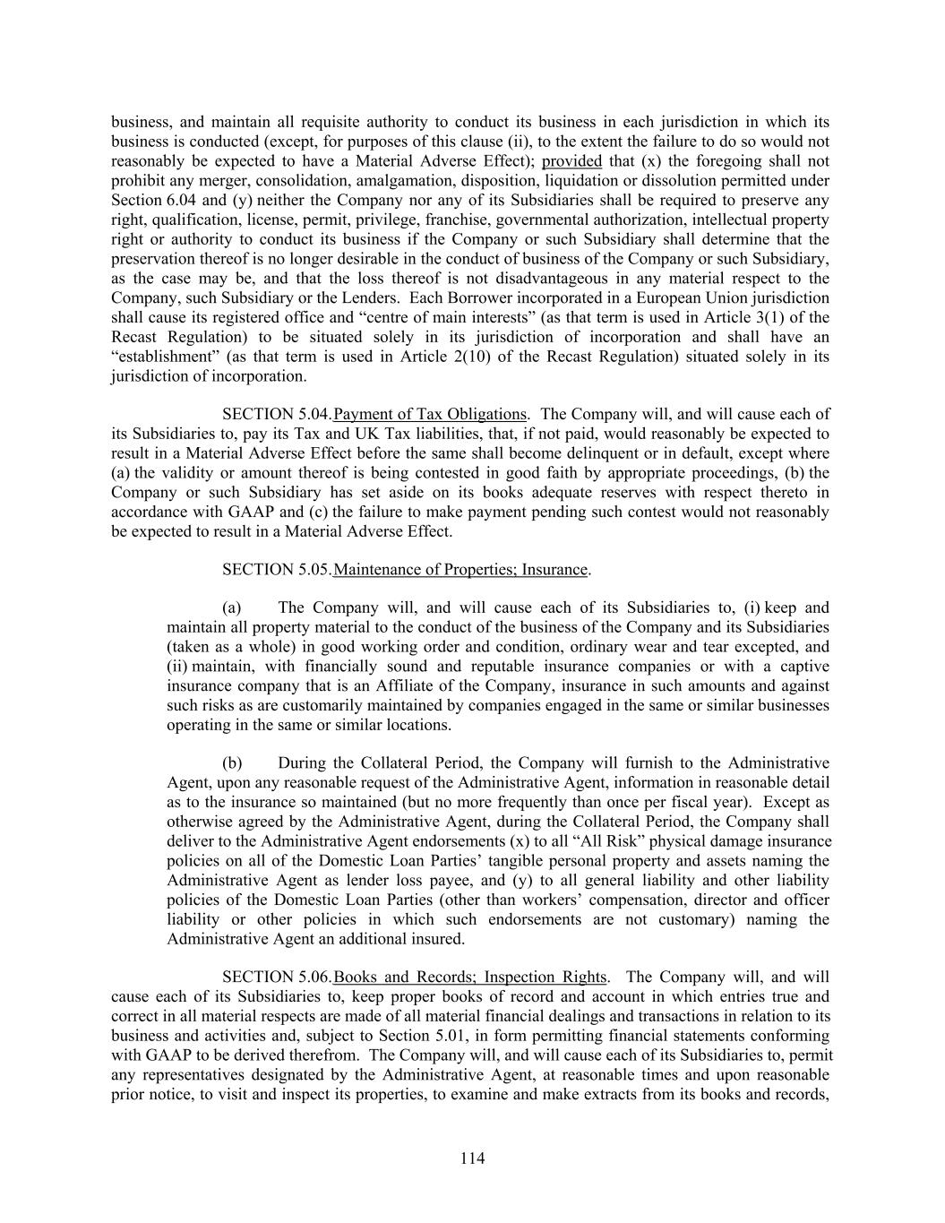business, and maintain all requisite authority to conduct its business in each jurisdiction in which its business is conducted (except, for purposes of this clause (ii), to the extent the failure to do so would not reasonably be expected to have a Material Adverse Effect); provided that (x) the foregoing shall not prohibit any merger, consolidation, amalgamation, disposition, liquidation or dissolution permitted under Section 6.04 and (y) neither the Company nor any of its Subsidiaries shall be required to preserve any right, qualification, license, permit, privilege, franchise, governmental authorization, intellectual property right or authority to conduct its business if the Company or such Subsidiary shall determine that the preservation thereof is no longer desirable in the conduct of business of the Company or such Subsidiary, as the case may be, and that the loss thereof is not disadvantageous in any material respect to the Company, such Subsidiary or the Lenders. Each Borrower incorporated in a European Union jurisdiction shall cause its registered office and “centre of main interests” (as that term is used in Article 3(1) of the Recast Regulation) to be situated solely in its jurisdiction of incorporation and shall have an “establishment” (as that term is used in Article 2(10) of the Recast Regulation) situated solely in its jurisdiction of incorporation. SECTION 5.04.Payment of Tax Obligations. The Company will, and will cause each of its Subsidiaries to, pay its Tax and UK Tax liabilities, that, if not paid, would reasonably be expected to result in a Material Adverse Effect before the same shall become delinquent or in default, except where (a) the validity or amount thereof is being contested in good faith by appropriate proceedings, (b) the Company or such Subsidiary has set aside on its books adequate reserves with respect thereto in accordance with GAAP and (c) the failure to make payment pending such contest would not reasonably be expected to result in a Material Adverse Effect. SECTION 5.05.Maintenance of Properties; Insurance. (a) The Company will, and will cause each of its Subsidiaries to, (i) keep and maintain all property material to the conduct of the business of the Company and its Subsidiaries (taken as a whole) in good working order and condition, ordinary wear and tear excepted, and (ii) maintain, with financially sound and reputable insurance companies or with a captive insurance company that is an Affiliate of the Company, insurance in such amounts and against such risks as are customarily maintained by companies engaged in the same or similar businesses operating in the same or similar locations. (b) During the Collateral Period, the Company will furnish to the Administrative Agent, upon any reasonable request of the Administrative Agent, information in reasonable detail as to the insurance so maintained (but no more frequently than once per fiscal year). Except as otherwise agreed by the Administrative Agent, during the Collateral Period, the Company shall deliver to the Administrative Agent endorsements (x) to all “All Risk” physical damage insurance policies on all of the Domestic Loan Parties’ tangible personal property and assets naming the Administrative Agent as lender loss payee, and (y) to all general liability and other liability policies of the Domestic Loan Parties (other than workers’ compensation, director and officer liability or other policies in which such endorsements are not customary) naming the Administrative Agent an additional insured. SECTION 5.06.Books and Records; Inspection Rights. The Company will, and will cause each of its Subsidiaries to, keep proper books of record and account in which entries true and correct in all material respects are made of all material financial dealings and transactions in relation to its business and activities and, subject to Section 5.01, in form permitting financial statements conforming with GAAP to be derived therefrom. The Company will, and will cause each of its Subsidiaries to, permit any representatives designated by the Administrative Agent, at reasonable times and upon reasonable prior notice, to visit and inspect its properties, to examine and make extracts from its books and records, 114