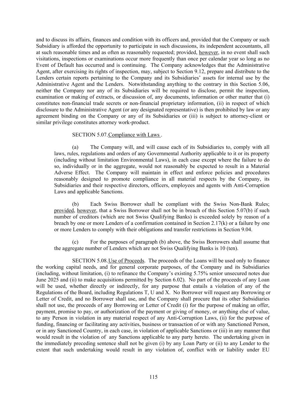 and to discuss its affairs, finances and condition with its officers and, provided that the Company or such Subsidiary is afforded the opportunity to participate in such discussions, its independent accountants, all at such reasonable times and as often as reasonably requested; provided, however, in no event shall such visitations, inspections or examinations occur more frequently than once per calendar year so long as no Event of Default has occurred and is continuing. The Company acknowledges that the Administrative Agent, after exercising its rights of inspection, may, subject to Section 9.12, prepare and distribute to the Lenders certain reports pertaining to the Company and its Subsidiaries’ assets for internal use by the Administrative Agent and the Lenders. Notwithstanding anything to the contrary in this Section 5.06, neither the Company nor any of its Subsidiaries will be required to disclose, permit the inspection, examination or making of extracts, or discussion of, any documents, information or other matter that (i) constitutes non-financial trade secrets or non-financial proprietary information, (ii) in respect of which disclosure to the Administrative Agent (or any designated representative) is then prohibited by law or any agreement binding on the Company or any of its Subsidiaries or (iii) is subject to attorney-client or similar privilege constitutes attorney work-product. SECTION 5.07.Compliance with Laws . (a) The Company will, and will cause each of its Subsidiaries to, comply with all laws, rules, regulations and orders of any Governmental Authority applicable to it or its property (including without limitation Environmental Laws), in each case except where the failure to do so, individually or in the aggregate, would not reasonably be expected to result in a Material Adverse Effect. The Company will maintain in effect and enforce policies and procedures reasonably designed to promote compliance in all material respects by the Company, its Subsidiaries and their respective directors, officers, employees and agents with Anti-Corruption Laws and applicable Sanctions. (b) Each Swiss Borrower shall be compliant with the Swiss Non-Bank Rules; provided, however, that a Swiss Borrower shall not be in breach of this Section 5.07(b) if such number of creditors (which are not Swiss Qualifying Banks) is exceeded solely by reason of a breach by one or more Lenders of a confirmation contained in Section 2.17(k) or a failure by one or more Lenders to comply with their obligations and transfer restrictions in Section 9.04. (c) For the purposes of paragraph (b) above, the Swiss Borrowers shall assume that the aggregate number of Lenders which are not Swiss Qualifying Banks is 10 (ten). SECTION 5.08.Use of Proceeds. The proceeds of the Loans will be used only to finance the working capital needs, and for general corporate purposes, of the Company and its Subsidiaries (including, without limitation, (i) to refinance the Company’s existing 5.75% senior unsecured notes due June 2025 and (ii) to make acquisitions permitted by Section 6.02). No part of the proceeds of any Loan will be used, whether directly or indirectly, for any purpose that entails a violation of any of the Regulations of the Board, including Regulations T, U and X. No Borrower will request any Borrowing or Letter of Credit, and no Borrower shall use, and the Company shall procure that its other Subsidiaries shall not use, the proceeds of any Borrowing or Letter of Credit (i) for the purpose of making an offer, payment, promise to pay, or authorization of the payment or giving of money, or anything else of value, to any Person in violation in any material respect of any Anti-Corruption Laws, (ii) for the purpose of funding, financing or facilitating any activities, business or transaction of or with any Sanctioned Person, or in any Sanctioned Country, in each case, in violation of applicable Sanctions or (iii) in any manner that would result in the violation of any Sanctions applicable to any party hereto. The undertaking given in the immediately preceding sentence shall not be given (i) by any Loan Party or (ii) to any Lender to the extent that such undertaking would result in any violation of, conflict with or liability under EU 115