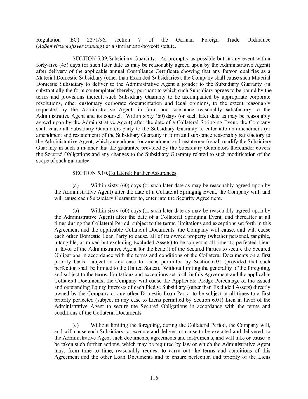 Regulation (EC) 2271/96, section 7 of the German Foreign Trade Ordinance (Außenwirtschaftsverordnung) or a similar anti-boycott statute. SECTION 5.09.Subsidiary Guaranty. As promptly as possible but in any event within forty-five (45) days (or such later date as may be reasonably agreed upon by the Administrative Agent) after delivery of the applicable annual Compliance Certificate showing that any Person qualifies as a Material Domestic Subsidiary (other than Excluded Subsidiaries), the Company shall cause such Material Domestic Subsidiary to deliver to the Administrative Agent a joinder to the Subsidiary Guaranty (in substantially the form contemplated thereby) pursuant to which such Subsidiary agrees to be bound by the terms and provisions thereof, such Subsidiary Guaranty to be accompanied by appropriate corporate resolutions, other customary corporate documentation and legal opinions, to the extent reasonably requested by the Administrative Agent, in form and substance reasonably satisfactory to the Administrative Agent and its counsel. Within sixty (60) days (or such later date as may be reasonably agreed upon by the Administrative Agent) after the date of a Collateral Springing Event, the Company shall cause all Subsidiary Guarantors party to the Subsidiary Guaranty to enter into an amendment (or amendment and restatement) of the Subsidiary Guaranty in form and substance reasonably satisfactory to the Administrative Agent, which amendment (or amendment and restatement) shall modify the Subsidiary Guaranty in such a manner that the guarantee provided by the Subsidiary Guarantors thereunder covers the Secured Obligations and any changes to the Subsidiary Guaranty related to such modification of the scope of such guarantee. SECTION 5.10.Collateral; Further Assurances. (a) Within sixty (60) days (or such later date as may be reasonably agreed upon by the Administrative Agent) after the date of a Collateral Springing Event, the Company will, and will cause each Subsidiary Guarantor to, enter into the Security Agreement. (b) Within sixty (60) days (or such later date as may be reasonably agreed upon by the Administrative Agent) after the date of a Collateral Springing Event, and thereafter at all times during the Collateral Period, subject to the terms, limitations and exceptions set forth in this Agreement and the applicable Collateral Documents, the Company will cause, and will cause each other Domestic Loan Party to cause, all of its owned property (whether personal, tangible, intangible, or mixed but excluding Excluded Assets) to be subject at all times to perfected Liens in favor of the Administrative Agent for the benefit of the Secured Parties to secure the Secured Obligations in accordance with the terms and conditions of the Collateral Documents on a first priority basis, subject in any case to Liens permitted by Section 6.01 (provided that such perfection shall be limited to the United States). Without limiting the generality of the foregoing, and subject to the terms, limitations and exceptions set forth in this Agreement and the applicable Collateral Documents, the Company will cause the Applicable Pledge Percentage of the issued and outstanding Equity Interests of each Pledge Subsidiary (other than Excluded Assets) directly owned by the Company or any other Domestic Loan Party to be subject at all times to a first priority perfected (subject in any case to Liens permitted by Section 6.01) Lien in favor of the Administrative Agent to secure the Secured Obligations in accordance with the terms and conditions of the Collateral Documents. (c) Without limiting the foregoing, during the Collateral Period, the Company will, and will cause each Subsidiary to, execute and deliver, or cause to be executed and delivered, to the Administrative Agent such documents, agreements and instruments, and will take or cause to be taken such further actions, which may be required by law or which the Administrative Agent may, from time to time, reasonably request to carry out the terms and conditions of this Agreement and the other Loan Documents and to ensure perfection and priority of the Liens 116