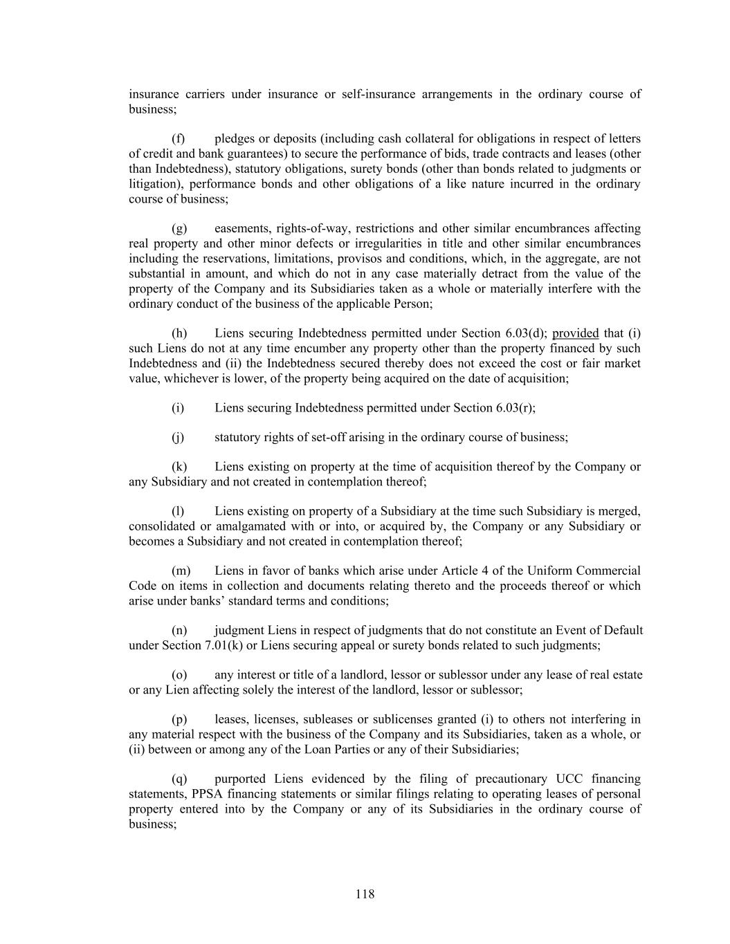 insurance carriers under insurance or self-insurance arrangements in the ordinary course of business; (f) pledges or deposits (including cash collateral for obligations in respect of letters of credit and bank guarantees) to secure the performance of bids, trade contracts and leases (other than Indebtedness), statutory obligations, surety bonds (other than bonds related to judgments or litigation), performance bonds and other obligations of a like nature incurred in the ordinary course of business; (g) easements, rights-of-way, restrictions and other similar encumbrances affecting real property and other minor defects or irregularities in title and other similar encumbrances including the reservations, limitations, provisos and conditions, which, in the aggregate, are not substantial in amount, and which do not in any case materially detract from the value of the property of the Company and its Subsidiaries taken as a whole or materially interfere with the ordinary conduct of the business of the applicable Person; (h) Liens securing Indebtedness permitted under Section 6.03(d); provided that (i) such Liens do not at any time encumber any property other than the property financed by such Indebtedness and (ii) the Indebtedness secured thereby does not exceed the cost or fair market value, whichever is lower, of the property being acquired on the date of acquisition; (i) Liens securing Indebtedness permitted under Section 6.03(r); (j) statutory rights of set-off arising in the ordinary course of business; (k) Liens existing on property at the time of acquisition thereof by the Company or any Subsidiary and not created in contemplation thereof; (l) Liens existing on property of a Subsidiary at the time such Subsidiary is merged, consolidated or amalgamated with or into, or acquired by, the Company or any Subsidiary or becomes a Subsidiary and not created in contemplation thereof; (m) Liens in favor of banks which arise under Article 4 of the Uniform Commercial Code on items in collection and documents relating thereto and the proceeds thereof or which arise under banks’ standard terms and conditions; (n) judgment Liens in respect of judgments that do not constitute an Event of Default under Section 7.01(k) or Liens securing appeal or surety bonds related to such judgments; (o) any interest or title of a landlord, lessor or sublessor under any lease of real estate or any Lien affecting solely the interest of the landlord, lessor or sublessor; (p) leases, licenses, subleases or sublicenses granted (i) to others not interfering in any material respect with the business of the Company and its Subsidiaries, taken as a whole, or (ii) between or among any of the Loan Parties or any of their Subsidiaries; (q) purported Liens evidenced by the filing of precautionary UCC financing statements, PPSA financing statements or similar filings relating to operating leases of personal property entered into by the Company or any of its Subsidiaries in the ordinary course of business; 118