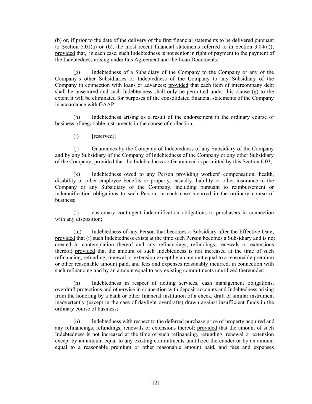 (b) or, if prior to the date of the delivery of the first financial statements to be delivered pursuant to Section 5.01(a) or (b), the most recent financial statements referred to in Section 3.04(a)); provided that, in each case, such Indebtedness is not senior in right of payment to the payment of the Indebtedness arising under this Agreement and the Loan Documents; (g) Indebtedness of a Subsidiary of the Company to the Company or any of the Company’s other Subsidiaries or Indebtedness of the Company to any Subsidiary of the Company in connection with loans or advances; provided that each item of intercompany debt shall be unsecured and such Indebtedness shall only be permitted under this clause (g) to the extent it will be eliminated for purposes of the consolidated financial statements of the Company in accordance with GAAP; (h) Indebtedness arising as a result of the endorsement in the ordinary course of business of negotiable instruments in the course of collection; (i) [reserved]; (j) Guarantees by the Company of Indebtedness of any Subsidiary of the Company and by any Subsidiary of the Company of Indebtedness of the Company or any other Subsidiary of the Company; provided that the Indebtedness so Guaranteed is permitted by this Section 6.03; (k) Indebtedness owed to any Person providing workers' compensation, health, disability or other employee benefits or property, casualty, liability or other insurance to the Company or any Subsidiary of the Company, including pursuant to reimbursement or indemnification obligations to such Person, in each case incurred in the ordinary course of business; (l) customary contingent indemnification obligations to purchasers in connection with any disposition; (m) Indebtedness of any Person that becomes a Subsidiary after the Effective Date; provided that (i) such Indebtedness exists at the time such Person becomes a Subsidiary and is not created in contemplation thereof and any refinancings, refundings, renewals or extensions thereof; provided that the amount of such Indebtedness is not increased at the time of such refinancing, refunding, renewal or extension except by an amount equal to a reasonable premium or other reasonable amount paid, and fees and expenses reasonably incurred, in connection with such refinancing and by an amount equal to any existing commitments unutilized thereunder; (n) Indebtedness in respect of netting services, cash management obligations, overdraft protections and otherwise in connection with deposit accounts and Indebtedness arising from the honoring by a bank or other financial institution of a check, draft or similar instrument inadvertently (except in the case of daylight overdrafts) drawn against insufficient funds in the ordinary course of business; (o) Indebtedness with respect to the deferred purchase price of property acquired and any refinancings, refundings, renewals or extensions thereof; provided that the amount of such Indebtedness is not increased at the time of such refinancing, refunding, renewal or extension except by an amount equal to any existing commitments unutilized thereunder or by an amount equal to a reasonable premium or other reasonable amount paid, and fees and expenses 121
