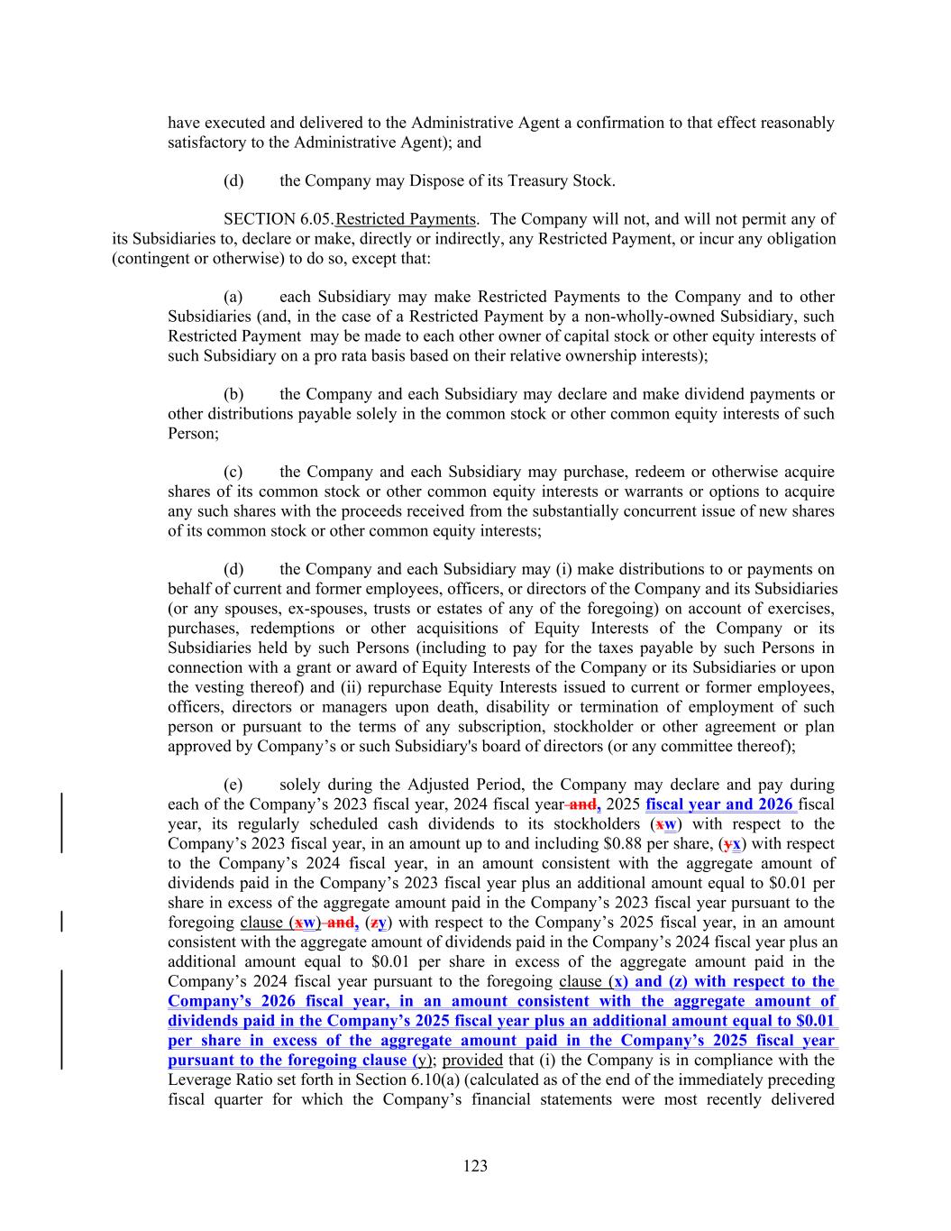 have executed and delivered to the Administrative Agent a confirmation to that effect reasonably satisfactory to the Administrative Agent); and (d) the Company may Dispose of its Treasury Stock. SECTION 6.05.Restricted Payments. The Company will not, and will not permit any of its Subsidiaries to, declare or make, directly or indirectly, any Restricted Payment, or incur any obligation (contingent or otherwise) to do so, except that: (a) each Subsidiary may make Restricted Payments to the Company and to other Subsidiaries (and, in the case of a Restricted Payment by a non-wholly-owned Subsidiary, such Restricted Payment may be made to each other owner of capital stock or other equity interests of such Subsidiary on a pro rata basis based on their relative ownership interests); (b) the Company and each Subsidiary may declare and make dividend payments or other distributions payable solely in the common stock or other common equity interests of such Person; (c) the Company and each Subsidiary may purchase, redeem or otherwise acquire shares of its common stock or other common equity interests or warrants or options to acquire any such shares with the proceeds received from the substantially concurrent issue of new shares of its common stock or other common equity interests; (d) the Company and each Subsidiary may (i) make distributions to or payments on behalf of current and former employees, officers, or directors of the Company and its Subsidiaries (or any spouses, ex-spouses, trusts or estates of any of the foregoing) on account of exercises, purchases, redemptions or other acquisitions of Equity Interests of the Company or its Subsidiaries held by such Persons (including to pay for the taxes payable by such Persons in connection with a grant or award of Equity Interests of the Company or its Subsidiaries or upon the vesting thereof) and (ii) repurchase Equity Interests issued to current or former employees, officers, directors or managers upon death, disability or termination of employment of such person or pursuant to the terms of any subscription, stockholder or other agreement or plan approved by Company’s or such Subsidiary's board of directors (or any committee thereof); (e) solely during the Adjusted Period, the Company may declare and pay during each of the Company’s 2023 fiscal year, 2024 fiscal year and, 2025 fiscal year and 2026 fiscal year, its regularly scheduled cash dividends to its stockholders (xw) with respect to the Company’s 2023 fiscal year, in an amount up to and including $0.88 per share, (yx) with respect to the Company’s 2024 fiscal year, in an amount consistent with the aggregate amount of dividends paid in the Company’s 2023 fiscal year plus an additional amount equal to $0.01 per share in excess of the aggregate amount paid in the Company’s 2023 fiscal year pursuant to the foregoing clause (xw) and, (zy) with respect to the Company’s 2025 fiscal year, in an amount consistent with the aggregate amount of dividends paid in the Company’s 2024 fiscal year plus an additional amount equal to $0.01 per share in excess of the aggregate amount paid in the Company’s 2024 fiscal year pursuant to the foregoing clause (x) and (z) with respect to the Company’s 2026 fiscal year, in an amount consistent with the aggregate amount of dividends paid in the Company’s 2025 fiscal year plus an additional amount equal to $0.01 per share in excess of the aggregate amount paid in the Company’s 2025 fiscal year pursuant to the foregoing clause (y); provided that (i) the Company is in compliance with the Leverage Ratio set forth in Section 6.10(a) (calculated as of the end of the immediately preceding fiscal quarter for which the Company’s financial statements were most recently delivered 123