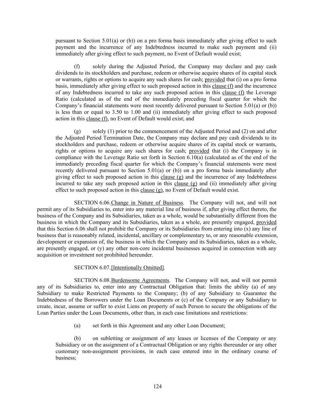 pursuant to Section 5.01(a) or (b)) on a pro forma basis immediately after giving effect to such payment and the incurrence of any Indebtedness incurred to make such payment and (ii) immediately after giving effect to such payment, no Event of Default would exist; (f) solely during the Adjusted Period, the Company may declare and pay cash dividends to its stockholders and purchase, redeem or otherwise acquire shares of its capital stock or warrants, rights or options to acquire any such shares for cash; provided that (i) on a pro forma basis, immediately after giving effect to such proposed action in this clause (f) and the incurrence of any Indebtedness incurred to take any such proposed action in this clause (f) the Leverage Ratio (calculated as of the end of the immediately preceding fiscal quarter for which the Company’s financial statements were most recently delivered pursuant to Section 5.01(a) or (b)) is less than or equal to 3.50 to 1.00 and (ii) immediately after giving effect to such proposed action in this clause (f), no Event of Default would exist; and (g) solely (1) prior to the commencement of the Adjusted Period and (2) on and after the Adjusted Period Termination Date, the Company may declare and pay cash dividends to its stockholders and purchase, redeem or otherwise acquire shares of its capital stock or warrants, rights or options to acquire any such shares for cash; provided that (i) the Company is in compliance with the Leverage Ratio set forth in Section 6.10(a) (calculated as of the end of the immediately preceding fiscal quarter for which the Company’s financial statements were most recently delivered pursuant to Section 5.01(a) or (b)) on a pro forma basis immediately after giving effect to such proposed action in this clause (g) and the incurrence of any Indebtedness incurred to take any such proposed action in this clause (g) and (ii) immediately after giving effect to such proposed action in this clause (g), no Event of Default would exist. SECTION 6.06.Change in Nature of Business. The Company will not, and will not permit any of its Subsidiaries to, enter into any material line of business if, after giving effect thereto, the business of the Company and its Subsidiaries, taken as a whole, would be substantially different from the business in which the Company and its Subsidiaries, taken as a whole, are presently engaged, provided that this Section 6.06 shall not prohibit the Company or its Subsidiaries from entering into (x) any line of business that is reasonably related, incidental, ancillary or complementary to, or any reasonable extension, development or expansion of, the business in which the Company and its Subsidiaries, taken as a whole, are presently engaged, or (y) any other non-core incidental businesses acquired in connection with any acquisition or investment not prohibited hereunder. SECTION 6.07.[Intentionally Omitted]. SECTION 6.08.Burdensome Agreements. The Company will not, and will not permit any of its Subsidiaries to, enter into any Contractual Obligation that: limits the ability (a) of any Subsidiary to make Restricted Payments to the Company; (b) of any Subsidiary to Guarantee the Indebtedness of the Borrowers under the Loan Documents or (c) of the Company or any Subsidiary to create, incur, assume or suffer to exist Liens on property of such Person to secure the obligations of the Loan Parties under the Loan Documents, other than, in each case limitations and restrictions: (a) set forth in this Agreement and any other Loan Document; (b) on subletting or assignment of any leases or licenses of the Company or any Subsidiary or on the assignment of a Contractual Obligation or any rights thereunder or any other customary non-assignment provisions, in each case entered into in the ordinary course of business; 124