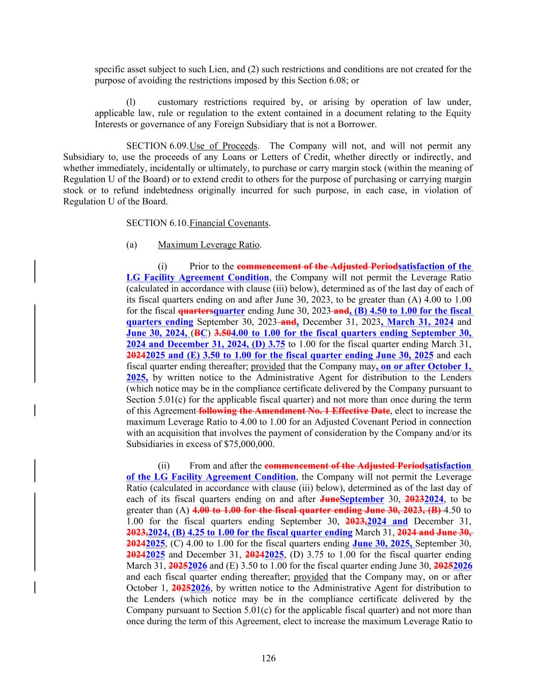 specific asset subject to such Lien, and (2) such restrictions and conditions are not created for the purpose of avoiding the restrictions imposed by this Section 6.08; or (l) customary restrictions required by, or arising by operation of law under, applicable law, rule or regulation to the extent contained in a document relating to the Equity Interests or governance of any Foreign Subsidiary that is not a Borrower. SECTION 6.09.Use of Proceeds. The Company will not, and will not permit any Subsidiary to, use the proceeds of any Loans or Letters of Credit, whether directly or indirectly, and whether immediately, incidentally or ultimately, to purchase or carry margin stock (within the meaning of Regulation U of the Board) or to extend credit to others for the purpose of purchasing or carrying margin stock or to refund indebtedness originally incurred for such purpose, in each case, in violation of Regulation U of the Board. SECTION 6.10.Financial Covenants. (a) Maximum Leverage Ratio. (i) Prior to the commencement of the Adjusted Periodsatisfaction of the LG Facility Agreement Condition, the Company will not permit the Leverage Ratio (calculated in accordance with clause (iii) below), determined as of the last day of each of its fiscal quarters ending on and after June 30, 2023, to be greater than (A) 4.00 to 1.00 for the fiscal quartersquarter ending June 30, 2023 and, (B) 4.50 to 1.00 for the fiscal quarters ending September 30, 2023 and, December 31, 2023, March 31, 2024 and June 30, 2024, (BC) 3.504.00 to 1.00 for the fiscal quarters ending September 30, 2024 and December 31, 2024, (D) 3.75 to 1.00 for the fiscal quarter ending March 31, 20242025 and (E) 3.50 to 1.00 for the fiscal quarter ending June 30, 2025 and each fiscal quarter ending thereafter; provided that the Company may, on or after October 1, 2025, by written notice to the Administrative Agent for distribution to the Lenders (which notice may be in the compliance certificate delivered by the Company pursuant to Section 5.01(c) for the applicable fiscal quarter) and not more than once during the term of this Agreement following the Amendment No. 1 Effective Date, elect to increase the maximum Leverage Ratio to 4.00 to 1.00 for an Adjusted Covenant Period in connection with an acquisition that involves the payment of consideration by the Company and/or its Subsidiaries in excess of $75,000,000. (ii) From and after the commencement of the Adjusted Periodsatisfaction of the LG Facility Agreement Condition, the Company will not permit the Leverage Ratio (calculated in accordance with clause (iii) below), determined as of the last day of each of its fiscal quarters ending on and after JuneSeptember 30, 20232024, to be greater than (A) 4.00 to 1.00 for the fiscal quarter ending June 30, 2023, (B) 4.50 to 1.00 for the fiscal quarters ending September 30, 2023,2024 and December 31, 2023,2024, (B) 4.25 to 1.00 for the fiscal quarter ending March 31, 2024 and June 30, 20242025, (C) 4.00 to 1.00 for the fiscal quarters ending June 30, 2025, September 30, 20242025 and December 31, 20242025, (D) 3.75 to 1.00 for the fiscal quarter ending March 31, 20252026 and (E) 3.50 to 1.00 for the fiscal quarter ending June 30, 20252026 and each fiscal quarter ending thereafter; provided that the Company may, on or after October 1, 20252026, by written notice to the Administrative Agent for distribution to the Lenders (which notice may be in the compliance certificate delivered by the Company pursuant to Section 5.01(c) for the applicable fiscal quarter) and not more than once during the term of this Agreement, elect to increase the maximum Leverage Ratio to 126