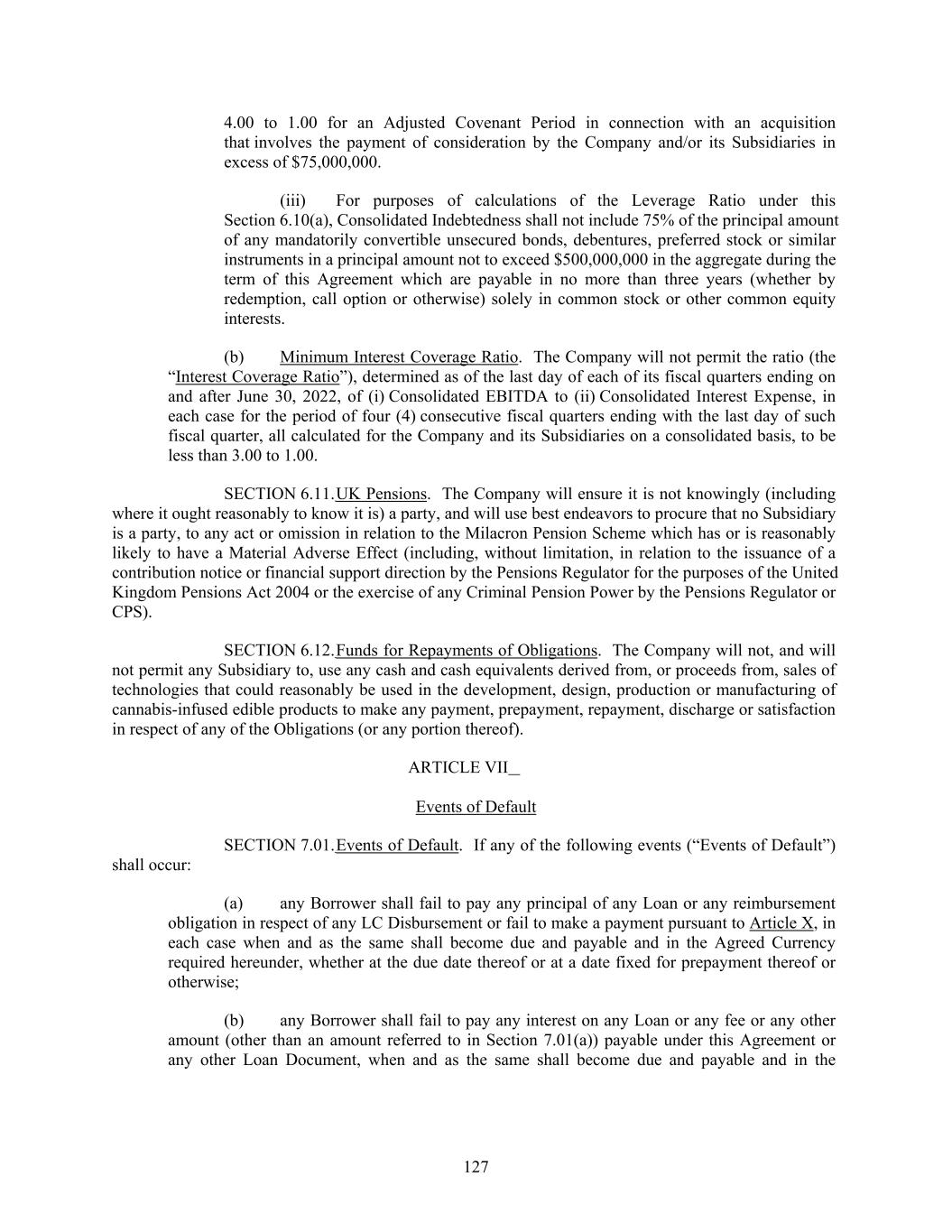 4.00 to 1.00 for an Adjusted Covenant Period in connection with an acquisition that involves the payment of consideration by the Company and/or its Subsidiaries in excess of $75,000,000. (iii) For purposes of calculations of the Leverage Ratio under this Section 6.10(a), Consolidated Indebtedness shall not include 75% of the principal amount of any mandatorily convertible unsecured bonds, debentures, preferred stock or similar instruments in a principal amount not to exceed $500,000,000 in the aggregate during the term of this Agreement which are payable in no more than three years (whether by redemption, call option or otherwise) solely in common stock or other common equity interests. (b) Minimum Interest Coverage Ratio. The Company will not permit the ratio (the “Interest Coverage Ratio”), determined as of the last day of each of its fiscal quarters ending on and after June 30, 2022, of (i) Consolidated EBITDA to (ii) Consolidated Interest Expense, in each case for the period of four (4) consecutive fiscal quarters ending with the last day of such fiscal quarter, all calculated for the Company and its Subsidiaries on a consolidated basis, to be less than 3.00 to 1.00. SECTION 6.11.UK Pensions. The Company will ensure it is not knowingly (including where it ought reasonably to know it is) a party, and will use best endeavors to procure that no Subsidiary is a party, to any act or omission in relation to the Milacron Pension Scheme which has or is reasonably likely to have a Material Adverse Effect (including, without limitation, in relation to the issuance of a contribution notice or financial support direction by the Pensions Regulator for the purposes of the United Kingdom Pensions Act 2004 or the exercise of any Criminal Pension Power by the Pensions Regulator or CPS). SECTION 6.12.Funds for Repayments of Obligations. The Company will not, and will not permit any Subsidiary to, use any cash and cash equivalents derived from, or proceeds from, sales of technologies that could reasonably be used in the development, design, production or manufacturing of cannabis-infused edible products to make any payment, prepayment, repayment, discharge or satisfaction in respect of any of the Obligations (or any portion thereof). ARTICLE VII Events of Default SECTION 7.01.Events of Default. If any of the following events (“Events of Default”) shall occur: (a) any Borrower shall fail to pay any principal of any Loan or any reimbursement obligation in respect of any LC Disbursement or fail to make a payment pursuant to Article X, in each case when and as the same shall become due and payable and in the Agreed Currency required hereunder, whether at the due date thereof or at a date fixed for prepayment thereof or otherwise; (b) any Borrower shall fail to pay any interest on any Loan or any fee or any other amount (other than an amount referred to in Section 7.01(a)) payable under this Agreement or any other Loan Document, when and as the same shall become due and payable and in the 127