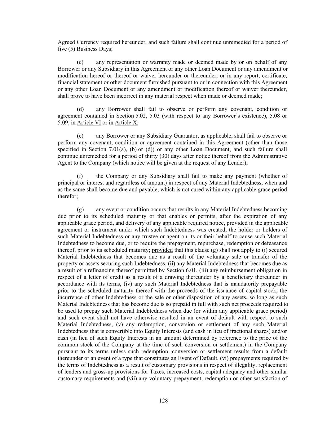 Agreed Currency required hereunder, and such failure shall continue unremedied for a period of five (5) Business Days; (c) any representation or warranty made or deemed made by or on behalf of any Borrower or any Subsidiary in this Agreement or any other Loan Document or any amendment or modification hereof or thereof or waiver hereunder or thereunder, or in any report, certificate, financial statement or other document furnished pursuant to or in connection with this Agreement or any other Loan Document or any amendment or modification thereof or waiver thereunder, shall prove to have been incorrect in any material respect when made or deemed made; (d) any Borrower shall fail to observe or perform any covenant, condition or agreement contained in Section 5.02, 5.03 (with respect to any Borrower’s existence), 5.08 or 5.09, in Article VI or in Article X; (e) any Borrower or any Subsidiary Guarantor, as applicable, shall fail to observe or perform any covenant, condition or agreement contained in this Agreement (other than those specified in Section 7.01(a), (b) or (d)) or any other Loan Document, and such failure shall continue unremedied for a period of thirty (30) days after notice thereof from the Administrative Agent to the Company (which notice will be given at the request of any Lender); (f) the Company or any Subsidiary shall fail to make any payment (whether of principal or interest and regardless of amount) in respect of any Material Indebtedness, when and as the same shall become due and payable, which is not cured within any applicable grace period therefor; (g) any event or condition occurs that results in any Material Indebtedness becoming due prior to its scheduled maturity or that enables or permits, after the expiration of any applicable grace period, and delivery of any applicable required notice, provided in the applicable agreement or instrument under which such Indebtedness was created, the holder or holders of such Material Indebtedness or any trustee or agent on its or their behalf to cause such Material Indebtedness to become due, or to require the prepayment, repurchase, redemption or defeasance thereof, prior to its scheduled maturity; provided that this clause (g) shall not apply to (i) secured Material Indebtedness that becomes due as a result of the voluntary sale or transfer of the property or assets securing such Indebtedness, (ii) any Material Indebtedness that becomes due as a result of a refinancing thereof permitted by Section 6.01, (iii) any reimbursement obligation in respect of a letter of credit as a result of a drawing thereunder by a beneficiary thereunder in accordance with its terms, (iv) any such Material Indebtedness that is mandatorily prepayable prior to the scheduled maturity thereof with the proceeds of the issuance of capital stock, the incurrence of other Indebtedness or the sale or other disposition of any assets, so long as such Material Indebtedness that has become due is so prepaid in full with such net proceeds required to be used to prepay such Material Indebtedness when due (or within any applicable grace period) and such event shall not have otherwise resulted in an event of default with respect to such Material Indebtedness, (v) any redemption, conversion or settlement of any such Material Indebtedness that is convertible into Equity Interests (and cash in lieu of fractional shares) and/or cash (in lieu of such Equity Interests in an amount determined by reference to the price of the common stock of the Company at the time of such conversion or settlement) in the Company pursuant to its terms unless such redemption, conversion or settlement results from a default thereunder or an event of a type that constitutes an Event of Default, (vi) prepayments required by the terms of Indebtedness as a result of customary provisions in respect of illegality, replacement of lenders and gross-up provisions for Taxes, increased costs, capital adequacy and other similar customary requirements and (vii) any voluntary prepayment, redemption or other satisfaction of 128