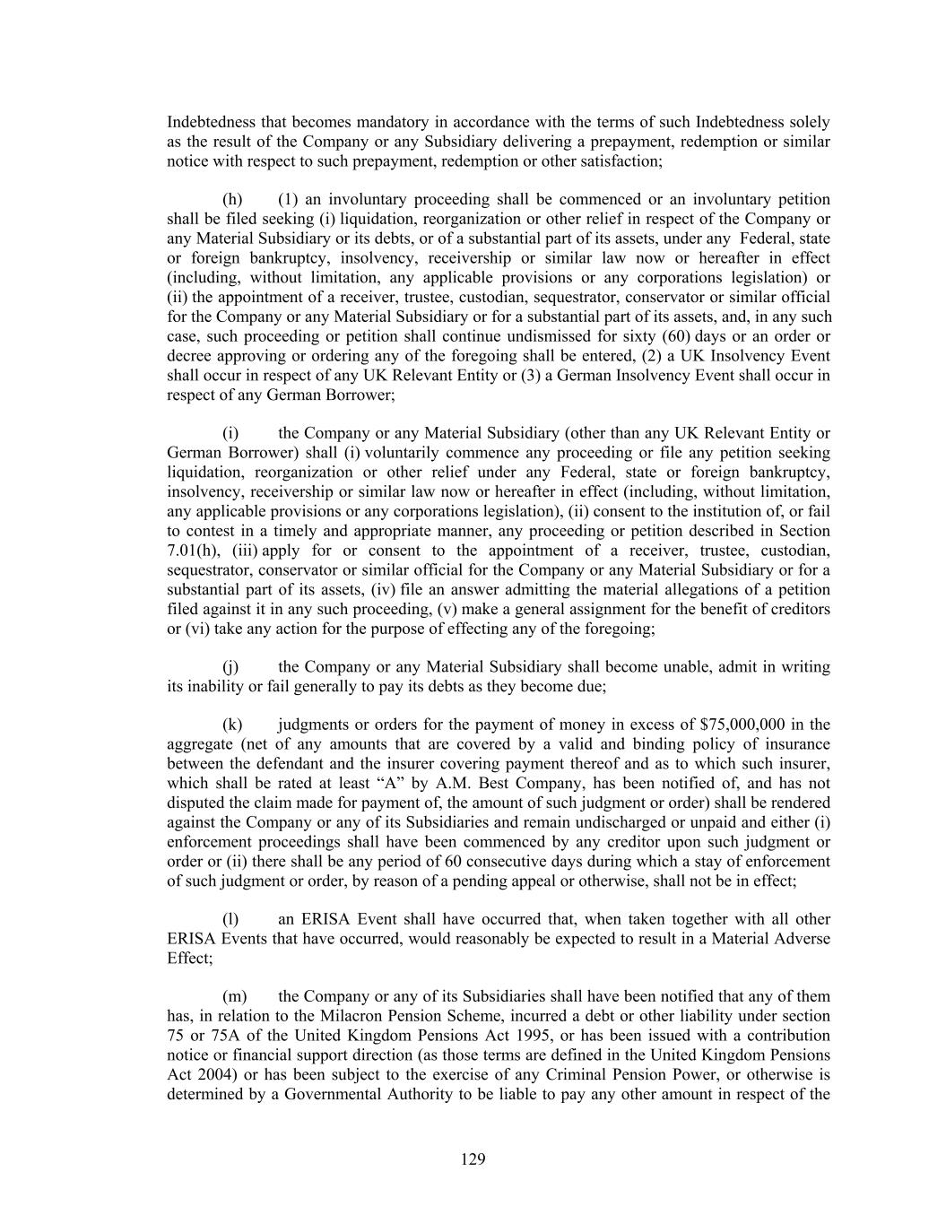 Indebtedness that becomes mandatory in accordance with the terms of such Indebtedness solely as the result of the Company or any Subsidiary delivering a prepayment, redemption or similar notice with respect to such prepayment, redemption or other satisfaction; (h) (1) an involuntary proceeding shall be commenced or an involuntary petition shall be filed seeking (i) liquidation, reorganization or other relief in respect of the Company or any Material Subsidiary or its debts, or of a substantial part of its assets, under any Federal, state or foreign bankruptcy, insolvency, receivership or similar law now or hereafter in effect (including, without limitation, any applicable provisions or any corporations legislation) or (ii) the appointment of a receiver, trustee, custodian, sequestrator, conservator or similar official for the Company or any Material Subsidiary or for a substantial part of its assets, and, in any such case, such proceeding or petition shall continue undismissed for sixty (60) days or an order or decree approving or ordering any of the foregoing shall be entered, (2) a UK Insolvency Event shall occur in respect of any UK Relevant Entity or (3) a German Insolvency Event shall occur in respect of any German Borrower; (i) the Company or any Material Subsidiary (other than any UK Relevant Entity or German Borrower) shall (i) voluntarily commence any proceeding or file any petition seeking liquidation, reorganization or other relief under any Federal, state or foreign bankruptcy, insolvency, receivership or similar law now or hereafter in effect (including, without limitation, any applicable provisions or any corporations legislation), (ii) consent to the institution of, or fail to contest in a timely and appropriate manner, any proceeding or petition described in Section 7.01(h), (iii) apply for or consent to the appointment of a receiver, trustee, custodian, sequestrator, conservator or similar official for the Company or any Material Subsidiary or for a substantial part of its assets, (iv) file an answer admitting the material allegations of a petition filed against it in any such proceeding, (v) make a general assignment for the benefit of creditors or (vi) take any action for the purpose of effecting any of the foregoing; (j) the Company or any Material Subsidiary shall become unable, admit in writing its inability or fail generally to pay its debts as they become due; (k) judgments or orders for the payment of money in excess of $75,000,000 in the aggregate (net of any amounts that are covered by a valid and binding policy of insurance between the defendant and the insurer covering payment thereof and as to which such insurer, which shall be rated at least “A” by A.M. Best Company, has been notified of, and has not disputed the claim made for payment of, the amount of such judgment or order) shall be rendered against the Company or any of its Subsidiaries and remain undischarged or unpaid and either (i) enforcement proceedings shall have been commenced by any creditor upon such judgment or order or (ii) there shall be any period of 60 consecutive days during which a stay of enforcement of such judgment or order, by reason of a pending appeal or otherwise, shall not be in effect; (l) an ERISA Event shall have occurred that, when taken together with all other ERISA Events that have occurred, would reasonably be expected to result in a Material Adverse Effect; (m) the Company or any of its Subsidiaries shall have been notified that any of them has, in relation to the Milacron Pension Scheme, incurred a debt or other liability under section 75 or 75A of the United Kingdom Pensions Act 1995, or has been issued with a contribution notice or financial support direction (as those terms are defined in the United Kingdom Pensions Act 2004) or has been subject to the exercise of any Criminal Pension Power, or otherwise is determined by a Governmental Authority to be liable to pay any other amount in respect of the 129