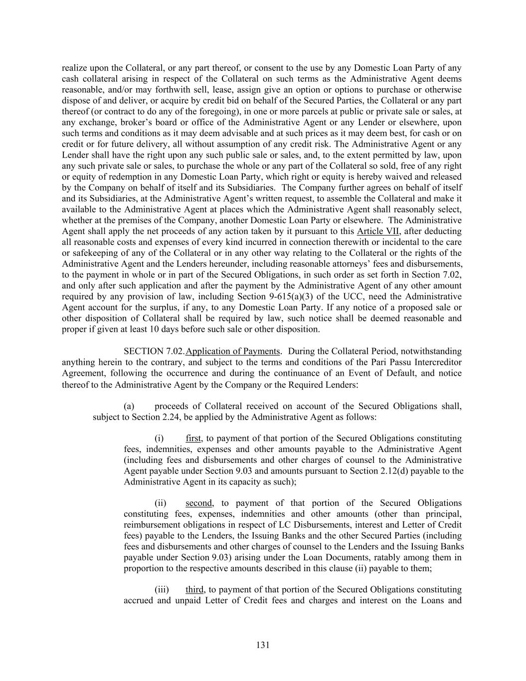 realize upon the Collateral, or any part thereof, or consent to the use by any Domestic Loan Party of any cash collateral arising in respect of the Collateral on such terms as the Administrative Agent deems reasonable, and/or may forthwith sell, lease, assign give an option or options to purchase or otherwise dispose of and deliver, or acquire by credit bid on behalf of the Secured Parties, the Collateral or any part thereof (or contract to do any of the foregoing), in one or more parcels at public or private sale or sales, at any exchange, broker’s board or office of the Administrative Agent or any Lender or elsewhere, upon such terms and conditions as it may deem advisable and at such prices as it may deem best, for cash or on credit or for future delivery, all without assumption of any credit risk. The Administrative Agent or any Lender shall have the right upon any such public sale or sales, and, to the extent permitted by law, upon any such private sale or sales, to purchase the whole or any part of the Collateral so sold, free of any right or equity of redemption in any Domestic Loan Party, which right or equity is hereby waived and released by the Company on behalf of itself and its Subsidiaries. The Company further agrees on behalf of itself and its Subsidiaries, at the Administrative Agent’s written request, to assemble the Collateral and make it available to the Administrative Agent at places which the Administrative Agent shall reasonably select, whether at the premises of the Company, another Domestic Loan Party or elsewhere. The Administrative Agent shall apply the net proceeds of any action taken by it pursuant to this Article VII, after deducting all reasonable costs and expenses of every kind incurred in connection therewith or incidental to the care or safekeeping of any of the Collateral or in any other way relating to the Collateral or the rights of the Administrative Agent and the Lenders hereunder, including reasonable attorneys’ fees and disbursements, to the payment in whole or in part of the Secured Obligations, in such order as set forth in Section 7.02, and only after such application and after the payment by the Administrative Agent of any other amount required by any provision of law, including Section 9-615(a)(3) of the UCC, need the Administrative Agent account for the surplus, if any, to any Domestic Loan Party. If any notice of a proposed sale or other disposition of Collateral shall be required by law, such notice shall be deemed reasonable and proper if given at least 10 days before such sale or other disposition. SECTION 7.02.Application of Payments. During the Collateral Period, notwithstanding anything herein to the contrary, and subject to the terms and conditions of the Pari Passu Intercreditor Agreement, following the occurrence and during the continuance of an Event of Default, and notice thereof to the Administrative Agent by the Company or the Required Lenders: (a) proceeds of Collateral received on account of the Secured Obligations shall, subject to Section 2.24, be applied by the Administrative Agent as follows: (i) first, to payment of that portion of the Secured Obligations constituting fees, indemnities, expenses and other amounts payable to the Administrative Agent (including fees and disbursements and other charges of counsel to the Administrative Agent payable under Section 9.03 and amounts pursuant to Section 2.12(d) payable to the Administrative Agent in its capacity as such); (ii) second, to payment of that portion of the Secured Obligations constituting fees, expenses, indemnities and other amounts (other than principal, reimbursement obligations in respect of LC Disbursements, interest and Letter of Credit fees) payable to the Lenders, the Issuing Banks and the other Secured Parties (including fees and disbursements and other charges of counsel to the Lenders and the Issuing Banks payable under Section 9.03) arising under the Loan Documents, ratably among them in proportion to the respective amounts described in this clause (ii) payable to them; (iii) third, to payment of that portion of the Secured Obligations constituting accrued and unpaid Letter of Credit fees and charges and interest on the Loans and 131