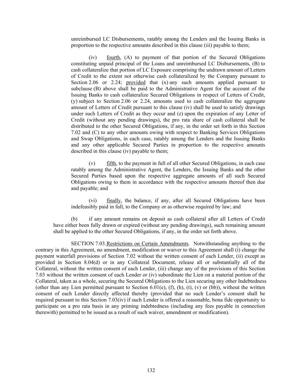 unreimbursed LC Disbursements, ratably among the Lenders and the Issuing Banks in proportion to the respective amounts described in this clause (iii) payable to them; (iv) fourth, (A) to payment of that portion of the Secured Obligations constituting unpaid principal of the Loans and unreimbursed LC Disbursements, (B) to cash collateralize that portion of LC Exposure comprising the undrawn amount of Letters of Credit to the extent not otherwise cash collateralized by the Company pursuant to Section 2.06 or 2.24; provided that (x) any such amounts applied pursuant to subclause (B) above shall be paid to the Administrative Agent for the account of the Issuing Banks to cash collateralize Secured Obligations in respect of Letters of Credit, (y) subject to Section 2.06 or 2.24, amounts used to cash collateralize the aggregate amount of Letters of Credit pursuant to this clause (iv) shall be used to satisfy drawings under such Letters of Credit as they occur and (z) upon the expiration of any Letter of Credit (without any pending drawings), the pro rata share of cash collateral shall be distributed to the other Secured Obligations, if any, in the order set forth in this Section 7.02 and (C) to any other amounts owing with respect to Banking Services Obligations and Swap Obligations, in each case, ratably among the Lenders and the Issuing Banks and any other applicable Secured Parties in proportion to the respective amounts described in this clause (iv) payable to them; (v) fifth, to the payment in full of all other Secured Obligations, in each case ratably among the Administrative Agent, the Lenders, the Issuing Banks and the other Secured Parties based upon the respective aggregate amounts of all such Secured Obligations owing to them in accordance with the respective amounts thereof then due and payable; and (vi) finally, the balance, if any, after all Secured Obligations have been indefeasibly paid in full, to the Company or as otherwise required by law; and (b) if any amount remains on deposit as cash collateral after all Letters of Credit have either been fully drawn or expired (without any pending drawings), such remaining amount shall be applied to the other Secured Obligations, if any, in the order set forth above. SECTION 7.03.Restrictions on Certain Amendments. Notwithstanding anything to the contrary in this Agreement, no amendment, modification or waiver to this Agreement shall (i) change the payment waterfall provisions of Section 7.02 without the written consent of each Lender, (ii) except as provided in Section 8.04(d) or in any Collateral Document, release all or substantially all of the Collateral, without the written consent of each Lender, (iii) change any of the provisions of this Section 7.03 without the written consent of each Lender or (iv) subordinate the Lien on a material portion of the Collateral, taken as a whole, securing the Secured Obligations to the Lien securing any other Indebtedness (other than any Lien permitted pursuant to Section 6.01(e), (f), (h), (t), (v) or (bb)), without the written consent of each Lender directly affected thereby (provided that no such Lender’s consent shall be required pursuant to this Section 7.03(iv) if such Lender is offered a reasonable, bona fide opportunity to participate on a pro rata basis in any priming indebtedness (including any fees payable in connection therewith) permitted to be issued as a result of such waiver, amendment or modification). 132