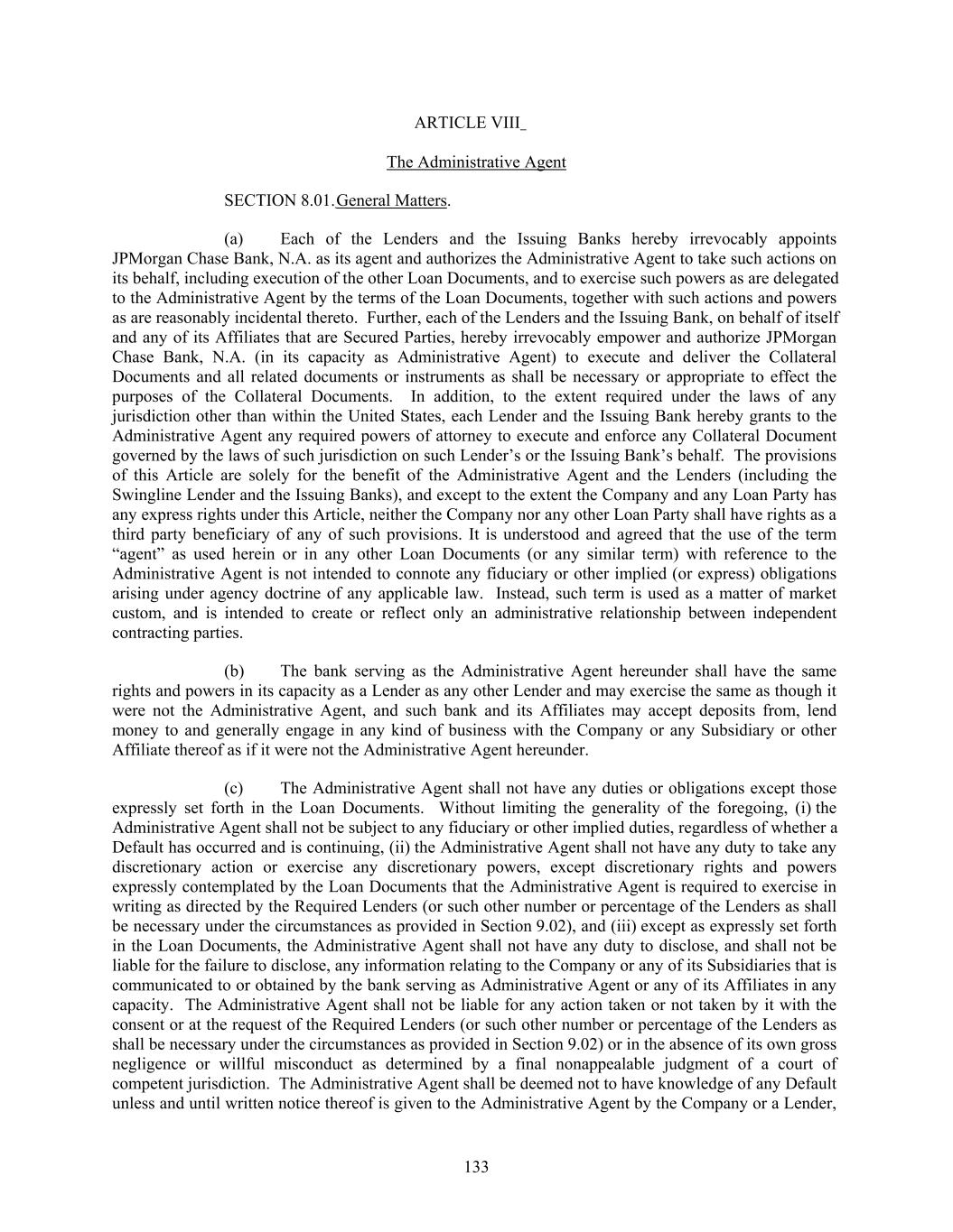 ARTICLE VIII The Administrative Agent SECTION 8.01.General Matters. (a) Each of the Lenders and the Issuing Banks hereby irrevocably appoints JPMorgan Chase Bank, N.A. as its agent and authorizes the Administrative Agent to take such actions on its behalf, including execution of the other Loan Documents, and to exercise such powers as are delegated to the Administrative Agent by the terms of the Loan Documents, together with such actions and powers as are reasonably incidental thereto. Further, each of the Lenders and the Issuing Bank, on behalf of itself and any of its Affiliates that are Secured Parties, hereby irrevocably empower and authorize JPMorgan Chase Bank, N.A. (in its capacity as Administrative Agent) to execute and deliver the Collateral Documents and all related documents or instruments as shall be necessary or appropriate to effect the purposes of the Collateral Documents. In addition, to the extent required under the laws of any jurisdiction other than within the United States, each Lender and the Issuing Bank hereby grants to the Administrative Agent any required powers of attorney to execute and enforce any Collateral Document governed by the laws of such jurisdiction on such Lender’s or the Issuing Bank’s behalf. The provisions of this Article are solely for the benefit of the Administrative Agent and the Lenders (including the Swingline Lender and the Issuing Banks), and except to the extent the Company and any Loan Party has any express rights under this Article, neither the Company nor any other Loan Party shall have rights as a third party beneficiary of any of such provisions. It is understood and agreed that the use of the term “agent” as used herein or in any other Loan Documents (or any similar term) with reference to the Administrative Agent is not intended to connote any fiduciary or other implied (or express) obligations arising under agency doctrine of any applicable law. Instead, such term is used as a matter of market custom, and is intended to create or reflect only an administrative relationship between independent contracting parties. (b) The bank serving as the Administrative Agent hereunder shall have the same rights and powers in its capacity as a Lender as any other Lender and may exercise the same as though it were not the Administrative Agent, and such bank and its Affiliates may accept deposits from, lend money to and generally engage in any kind of business with the Company or any Subsidiary or other Affiliate thereof as if it were not the Administrative Agent hereunder. (c) The Administrative Agent shall not have any duties or obligations except those expressly set forth in the Loan Documents. Without limiting the generality of the foregoing, (i) the Administrative Agent shall not be subject to any fiduciary or other implied duties, regardless of whether a Default has occurred and is continuing, (ii) the Administrative Agent shall not have any duty to take any discretionary action or exercise any discretionary powers, except discretionary rights and powers expressly contemplated by the Loan Documents that the Administrative Agent is required to exercise in writing as directed by the Required Lenders (or such other number or percentage of the Lenders as shall be necessary under the circumstances as provided in Section 9.02), and (iii) except as expressly set forth in the Loan Documents, the Administrative Agent shall not have any duty to disclose, and shall not be liable for the failure to disclose, any information relating to the Company or any of its Subsidiaries that is communicated to or obtained by the bank serving as Administrative Agent or any of its Affiliates in any capacity. The Administrative Agent shall not be liable for any action taken or not taken by it with the consent or at the request of the Required Lenders (or such other number or percentage of the Lenders as shall be necessary under the circumstances as provided in Section 9.02) or in the absence of its own gross negligence or willful misconduct as determined by a final nonappealable judgment of a court of competent jurisdiction. The Administrative Agent shall be deemed not to have knowledge of any Default unless and until written notice thereof is given to the Administrative Agent by the Company or a Lender, 133