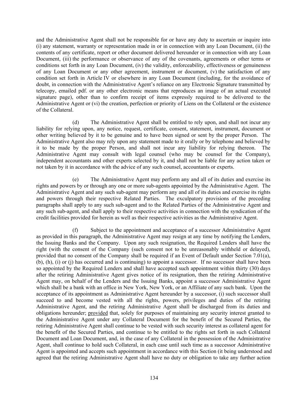 and the Administrative Agent shall not be responsible for or have any duty to ascertain or inquire into (i) any statement, warranty or representation made in or in connection with any Loan Document, (ii) the contents of any certificate, report or other document delivered hereunder or in connection with any Loan Document, (iii) the performance or observance of any of the covenants, agreements or other terms or conditions set forth in any Loan Document, (iv) the validity, enforceability, effectiveness or genuineness of any Loan Document or any other agreement, instrument or document, (v) the satisfaction of any condition set forth in Article IV or elsewhere in any Loan Document (including, for the avoidance of doubt, in connection with the Administrative Agent’s reliance on any Electronic Signature transmitted by telecopy, emailed pdf. or any other electronic means that reproduces an image of an actual executed signature page), other than to confirm receipt of items expressly required to be delivered to the Administrative Agent or (vi) the creation, perfection or priority of Liens on the Collateral or the existence of the Collateral. (d) The Administrative Agent shall be entitled to rely upon, and shall not incur any liability for relying upon, any notice, request, certificate, consent, statement, instrument, document or other writing believed by it to be genuine and to have been signed or sent by the proper Person. The Administrative Agent also may rely upon any statement made to it orally or by telephone and believed by it to be made by the proper Person, and shall not incur any liability for relying thereon. The Administrative Agent may consult with legal counsel (who may be counsel for the Company), independent accountants and other experts selected by it, and shall not be liable for any action taken or not taken by it in accordance with the advice of any such counsel, accountants or experts. (e) The Administrative Agent may perform any and all of its duties and exercise its rights and powers by or through any one or more sub-agents appointed by the Administrative Agent. The Administrative Agent and any such sub-agent may perform any and all of its duties and exercise its rights and powers through their respective Related Parties. The exculpatory provisions of the preceding paragraphs shall apply to any such sub-agent and to the Related Parties of the Administrative Agent and any such sub-agent, and shall apply to their respective activities in connection with the syndication of the credit facilities provided for herein as well as their respective activities as the Administrative Agent. (f) Subject to the appointment and acceptance of a successor Administrative Agent as provided in this paragraph, the Administrative Agent may resign at any time by notifying the Lenders, the Issuing Banks and the Company. Upon any such resignation, the Required Lenders shall have the right (with the consent of the Company (such consent not to be unreasonably withheld or delayed), provided that no consent of the Company shall be required if an Event of Default under Section 7.01(a), (b), (h), (i) or (j) has occurred and is continuing) to appoint a successor. If no successor shall have been so appointed by the Required Lenders and shall have accepted such appointment within thirty (30) days after the retiring Administrative Agent gives notice of its resignation, then the retiring Administrative Agent may, on behalf of the Lenders and the Issuing Banks, appoint a successor Administrative Agent which shall be a bank with an office in New York, New York, or an Affiliate of any such bank. Upon the acceptance of its appointment as Administrative Agent hereunder by a successor, (i) such successor shall succeed to and become vested with all the rights, powers, privileges and duties of the retiring Administrative Agent, and the retiring Administrative Agent shall be discharged from its duties and obligations hereunder; provided that, solely for purposes of maintaining any security interest granted to the Administrative Agent under any Collateral Document for the benefit of the Secured Parties, the retiring Administrative Agent shall continue to be vested with such security interest as collateral agent for the benefit of the Secured Parties, and continue to be entitled to the rights set forth in such Collateral Document and Loan Document, and, in the case of any Collateral in the possession of the Administrative Agent, shall continue to hold such Collateral, in each case until such time as a successor Administrative Agent is appointed and accepts such appointment in accordance with this Section (it being understood and agreed that the retiring Administrative Agent shall have no duty or obligation to take any further action 134
