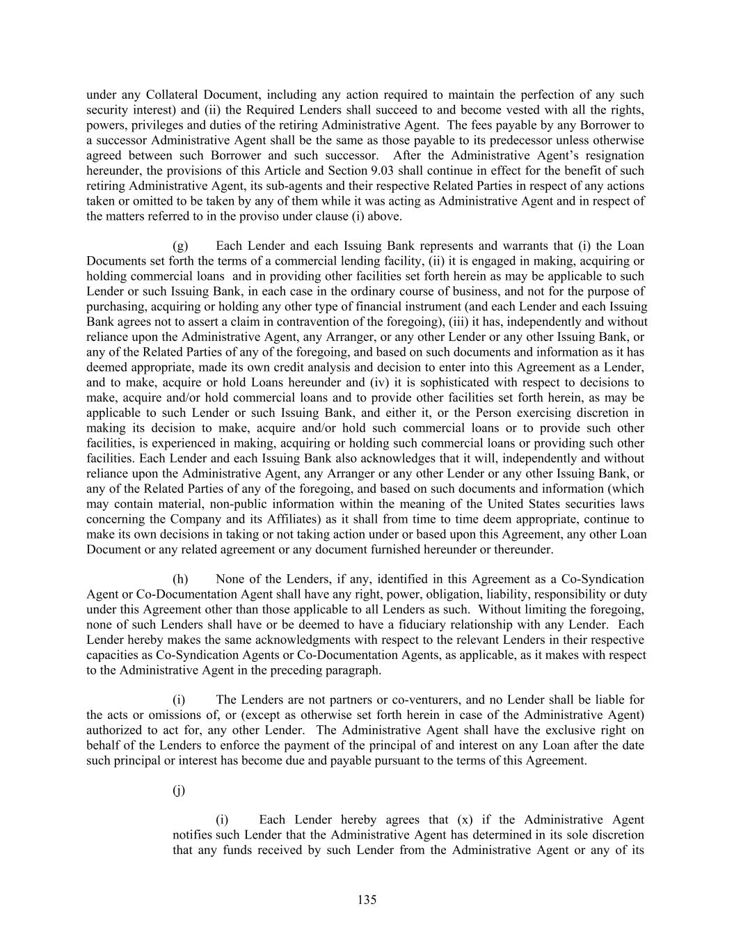 under any Collateral Document, including any action required to maintain the perfection of any such security interest) and (ii) the Required Lenders shall succeed to and become vested with all the rights, powers, privileges and duties of the retiring Administrative Agent. The fees payable by any Borrower to a successor Administrative Agent shall be the same as those payable to its predecessor unless otherwise agreed between such Borrower and such successor. After the Administrative Agent’s resignation hereunder, the provisions of this Article and Section 9.03 shall continue in effect for the benefit of such retiring Administrative Agent, its sub-agents and their respective Related Parties in respect of any actions taken or omitted to be taken by any of them while it was acting as Administrative Agent and in respect of the matters referred to in the proviso under clause (i) above. (g) Each Lender and each Issuing Bank represents and warrants that (i) the Loan Documents set forth the terms of a commercial lending facility, (ii) it is engaged in making, acquiring or holding commercial loans and in providing other facilities set forth herein as may be applicable to such Lender or such Issuing Bank, in each case in the ordinary course of business, and not for the purpose of purchasing, acquiring or holding any other type of financial instrument (and each Lender and each Issuing Bank agrees not to assert a claim in contravention of the foregoing), (iii) it has, independently and without reliance upon the Administrative Agent, any Arranger, or any other Lender or any other Issuing Bank, or any of the Related Parties of any of the foregoing, and based on such documents and information as it has deemed appropriate, made its own credit analysis and decision to enter into this Agreement as a Lender, and to make, acquire or hold Loans hereunder and (iv) it is sophisticated with respect to decisions to make, acquire and/or hold commercial loans and to provide other facilities set forth herein, as may be applicable to such Lender or such Issuing Bank, and either it, or the Person exercising discretion in making its decision to make, acquire and/or hold such commercial loans or to provide such other facilities, is experienced in making, acquiring or holding such commercial loans or providing such other facilities. Each Lender and each Issuing Bank also acknowledges that it will, independently and without reliance upon the Administrative Agent, any Arranger or any other Lender or any other Issuing Bank, or any of the Related Parties of any of the foregoing, and based on such documents and information (which may contain material, non-public information within the meaning of the United States securities laws concerning the Company and its Affiliates) as it shall from time to time deem appropriate, continue to make its own decisions in taking or not taking action under or based upon this Agreement, any other Loan Document or any related agreement or any document furnished hereunder or thereunder. (h) None of the Lenders, if any, identified in this Agreement as a Co-Syndication Agent or Co-Documentation Agent shall have any right, power, obligation, liability, responsibility or duty under this Agreement other than those applicable to all Lenders as such. Without limiting the foregoing, none of such Lenders shall have or be deemed to have a fiduciary relationship with any Lender. Each Lender hereby makes the same acknowledgments with respect to the relevant Lenders in their respective capacities as Co-Syndication Agents or Co-Documentation Agents, as applicable, as it makes with respect to the Administrative Agent in the preceding paragraph. (i) The Lenders are not partners or co-venturers, and no Lender shall be liable for the acts or omissions of, or (except as otherwise set forth herein in case of the Administrative Agent) authorized to act for, any other Lender. The Administrative Agent shall have the exclusive right on behalf of the Lenders to enforce the payment of the principal of and interest on any Loan after the date such principal or interest has become due and payable pursuant to the terms of this Agreement. (j) (i) Each Lender hereby agrees that (x) if the Administrative Agent notifies such Lender that the Administrative Agent has determined in its sole discretion that any funds received by such Lender from the Administrative Agent or any of its 135