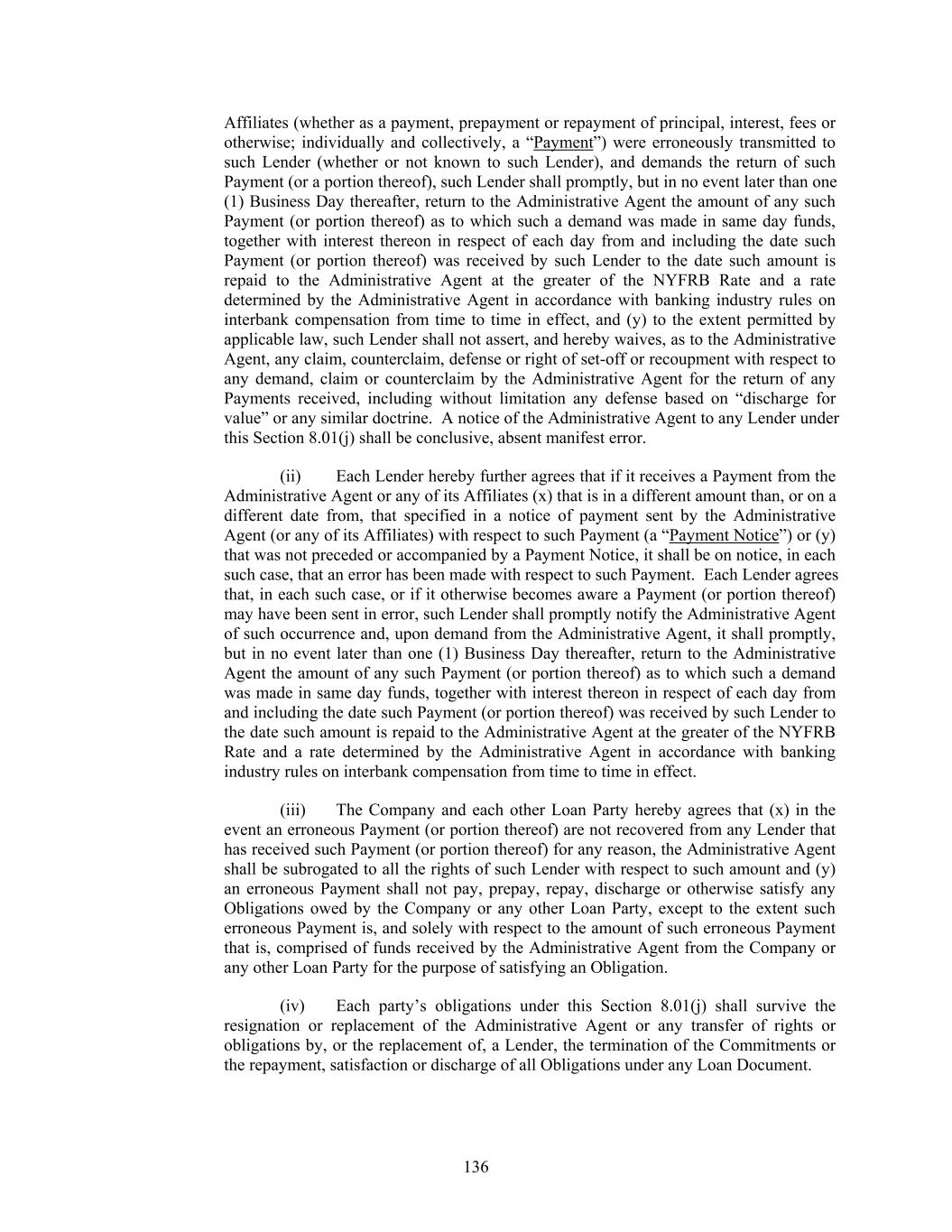Affiliates (whether as a payment, prepayment or repayment of principal, interest, fees or otherwise; individually and collectively, a “Payment”) were erroneously transmitted to such Lender (whether or not known to such Lender), and demands the return of such Payment (or a portion thereof), such Lender shall promptly, but in no event later than one (1) Business Day thereafter, return to the Administrative Agent the amount of any such Payment (or portion thereof) as to which such a demand was made in same day funds, together with interest thereon in respect of each day from and including the date such Payment (or portion thereof) was received by such Lender to the date such amount is repaid to the Administrative Agent at the greater of the NYFRB Rate and a rate determined by the Administrative Agent in accordance with banking industry rules on interbank compensation from time to time in effect, and (y) to the extent permitted by applicable law, such Lender shall not assert, and hereby waives, as to the Administrative Agent, any claim, counterclaim, defense or right of set-off or recoupment with respect to any demand, claim or counterclaim by the Administrative Agent for the return of any Payments received, including without limitation any defense based on “discharge for value” or any similar doctrine. A notice of the Administrative Agent to any Lender under this Section 8.01(j) shall be conclusive, absent manifest error. (ii) Each Lender hereby further agrees that if it receives a Payment from the Administrative Agent or any of its Affiliates (x) that is in a different amount than, or on a different date from, that specified in a notice of payment sent by the Administrative Agent (or any of its Affiliates) with respect to such Payment (a “Payment Notice”) or (y) that was not preceded or accompanied by a Payment Notice, it shall be on notice, in each such case, that an error has been made with respect to such Payment. Each Lender agrees that, in each such case, or if it otherwise becomes aware a Payment (or portion thereof) may have been sent in error, such Lender shall promptly notify the Administrative Agent of such occurrence and, upon demand from the Administrative Agent, it shall promptly, but in no event later than one (1) Business Day thereafter, return to the Administrative Agent the amount of any such Payment (or portion thereof) as to which such a demand was made in same day funds, together with interest thereon in respect of each day from and including the date such Payment (or portion thereof) was received by such Lender to the date such amount is repaid to the Administrative Agent at the greater of the NYFRB Rate and a rate determined by the Administrative Agent in accordance with banking industry rules on interbank compensation from time to time in effect. (iii) The Company and each other Loan Party hereby agrees that (x) in the event an erroneous Payment (or portion thereof) are not recovered from any Lender that has received such Payment (or portion thereof) for any reason, the Administrative Agent shall be subrogated to all the rights of such Lender with respect to such amount and (y) an erroneous Payment shall not pay, prepay, repay, discharge or otherwise satisfy any Obligations owed by the Company or any other Loan Party, except to the extent such erroneous Payment is, and solely with respect to the amount of such erroneous Payment that is, comprised of funds received by the Administrative Agent from the Company or any other Loan Party for the purpose of satisfying an Obligation. (iv) Each party’s obligations under this Section 8.01(j) shall survive the resignation or replacement of the Administrative Agent or any transfer of rights or obligations by, or the replacement of, a Lender, the termination of the Commitments or the repayment, satisfaction or discharge of all Obligations under any Loan Document. 136
