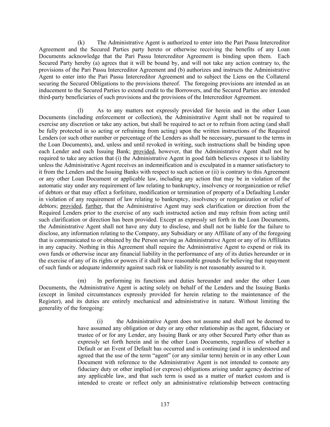 (k) The Administrative Agent is authorized to enter into the Pari Passu Intercreditor Agreement and the Secured Parties party hereto or otherwise receiving the benefits of any Loan Documents acknowledge that the Pari Passu Intercreditor Agreement is binding upon them. Each Secured Party hereby (a) agrees that it will be bound by, and will not take any action contrary to, the provisions of the Pari Passu Intercreditor Agreement and (b) authorizes and instructs the Administrative Agent to enter into the Pari Passu Intercreditor Agreement and to subject the Liens on the Collateral securing the Secured Obligations to the provisions thereof. The foregoing provisions are intended as an inducement to the Secured Parties to extend credit to the Borrowers, and the Secured Parties are intended third-party beneficiaries of such provisions and the provisions of the Intercreditor Agreement. (l) As to any matters not expressly provided for herein and in the other Loan Documents (including enforcement or collection), the Administrative Agent shall not be required to exercise any discretion or take any action, but shall be required to act or to refrain from acting (and shall be fully protected in so acting or refraining from acting) upon the written instructions of the Required Lenders (or such other number or percentage of the Lenders as shall be necessary, pursuant to the terms in the Loan Documents), and, unless and until revoked in writing, such instructions shall be binding upon each Lender and each Issuing Bank; provided, however, that the Administrative Agent shall not be required to take any action that (i) the Administrative Agent in good faith believes exposes it to liability unless the Administrative Agent receives an indemnification and is exculpated in a manner satisfactory to it from the Lenders and the Issuing Banks with respect to such action or (ii) is contrary to this Agreement or any other Loan Document or applicable law, including any action that may be in violation of the automatic stay under any requirement of law relating to bankruptcy, insolvency or reorganization or relief of debtors or that may effect a forfeiture, modification or termination of property of a Defaulting Lender in violation of any requirement of law relating to bankruptcy, insolvency or reorganization or relief of debtors; provided, further, that the Administrative Agent may seek clarification or direction from the Required Lenders prior to the exercise of any such instructed action and may refrain from acting until such clarification or direction has been provided. Except as expressly set forth in the Loan Documents, the Administrative Agent shall not have any duty to disclose, and shall not be liable for the failure to disclose, any information relating to the Company, any Subsidiary or any Affiliate of any of the foregoing that is communicated to or obtained by the Person serving as Administrative Agent or any of its Affiliates in any capacity. Nothing in this Agreement shall require the Administrative Agent to expend or risk its own funds or otherwise incur any financial liability in the performance of any of its duties hereunder or in the exercise of any of its rights or powers if it shall have reasonable grounds for believing that repayment of such funds or adequate indemnity against such risk or liability is not reasonably assured to it. (m) In performing its functions and duties hereunder and under the other Loan Documents, the Administrative Agent is acting solely on behalf of the Lenders and the Issuing Banks (except in limited circumstances expressly provided for herein relating to the maintenance of the Register), and its duties are entirely mechanical and administrative in nature. Without limiting the generality of the foregoing: (i) the Administrative Agent does not assume and shall not be deemed to have assumed any obligation or duty or any other relationship as the agent, fiduciary or trustee of or for any Lender, any Issuing Bank or any other Secured Party other than as expressly set forth herein and in the other Loan Documents, regardless of whether a Default or an Event of Default has occurred and is continuing (and it is understood and agreed that the use of the term “agent” (or any similar term) herein or in any other Loan Document with reference to the Administrative Agent is not intended to connote any fiduciary duty or other implied (or express) obligations arising under agency doctrine of any applicable law, and that such term is used as a matter of market custom and is intended to create or reflect only an administrative relationship between contracting 137