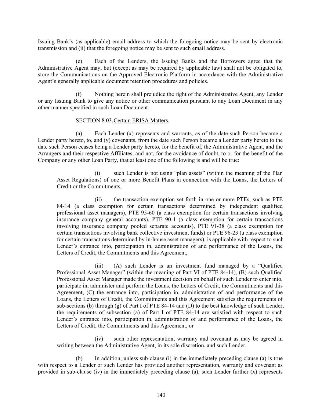 Issuing Bank’s (as applicable) email address to which the foregoing notice may be sent by electronic transmission and (ii) that the foregoing notice may be sent to such email address. (e) Each of the Lenders, the Issuing Banks and the Borrowers agree that the Administrative Agent may, but (except as may be required by applicable law) shall not be obligated to, store the Communications on the Approved Electronic Platform in accordance with the Administrative Agent’s generally applicable document retention procedures and policies. (f) Nothing herein shall prejudice the right of the Administrative Agent, any Lender or any Issuing Bank to give any notice or other communication pursuant to any Loan Document in any other manner specified in such Loan Document. SECTION 8.03.Certain ERISA Matters. (a) Each Lender (x) represents and warrants, as of the date such Person became a Lender party hereto, to, and (y) covenants, from the date such Person became a Lender party hereto to the date such Person ceases being a Lender party hereto, for the benefit of, the Administrative Agent, and the Arrangers and their respective Affiliates, and not, for the avoidance of doubt, to or for the benefit of the Company or any other Loan Party, that at least one of the following is and will be true: (i) such Lender is not using “plan assets” (within the meaning of the Plan Asset Regulations) of one or more Benefit Plans in connection with the Loans, the Letters of Credit or the Commitments, (ii) the transaction exemption set forth in one or more PTEs, such as PTE 84-14 (a class exemption for certain transactions determined by independent qualified professional asset managers), PTE 95-60 (a class exemption for certain transactions involving insurance company general accounts), PTE 90-1 (a class exemption for certain transactions involving insurance company pooled separate accounts), PTE 91-38 (a class exemption for certain transactions involving bank collective investment funds) or PTE 96-23 (a class exemption for certain transactions determined by in-house asset managers), is applicable with respect to such Lender’s entrance into, participation in, administration of and performance of the Loans, the Letters of Credit, the Commitments and this Agreement, (iii) (A) such Lender is an investment fund managed by a “Qualified Professional Asset Manager” (within the meaning of Part VI of PTE 84-14), (B) such Qualified Professional Asset Manager made the investment decision on behalf of such Lender to enter into, participate in, administer and perform the Loans, the Letters of Credit, the Commitments and this Agreement, (C) the entrance into, participation in, administration of and performance of the Loans, the Letters of Credit, the Commitments and this Agreement satisfies the requirements of sub-sections (b) through (g) of Part I of PTE 84-14 and (D) to the best knowledge of such Lender, the requirements of subsection (a) of Part I of PTE 84-14 are satisfied with respect to such Lender’s entrance into, participation in, administration of and performance of the Loans, the Letters of Credit, the Commitments and this Agreement, or (iv) such other representation, warranty and covenant as may be agreed in writing between the Administrative Agent, in its sole discretion, and such Lender. (b) In addition, unless sub-clause (i) in the immediately preceding clause (a) is true with respect to a Lender or such Lender has provided another representation, warranty and covenant as provided in sub-clause (iv) in the immediately preceding clause (a), such Lender further (x) represents 140