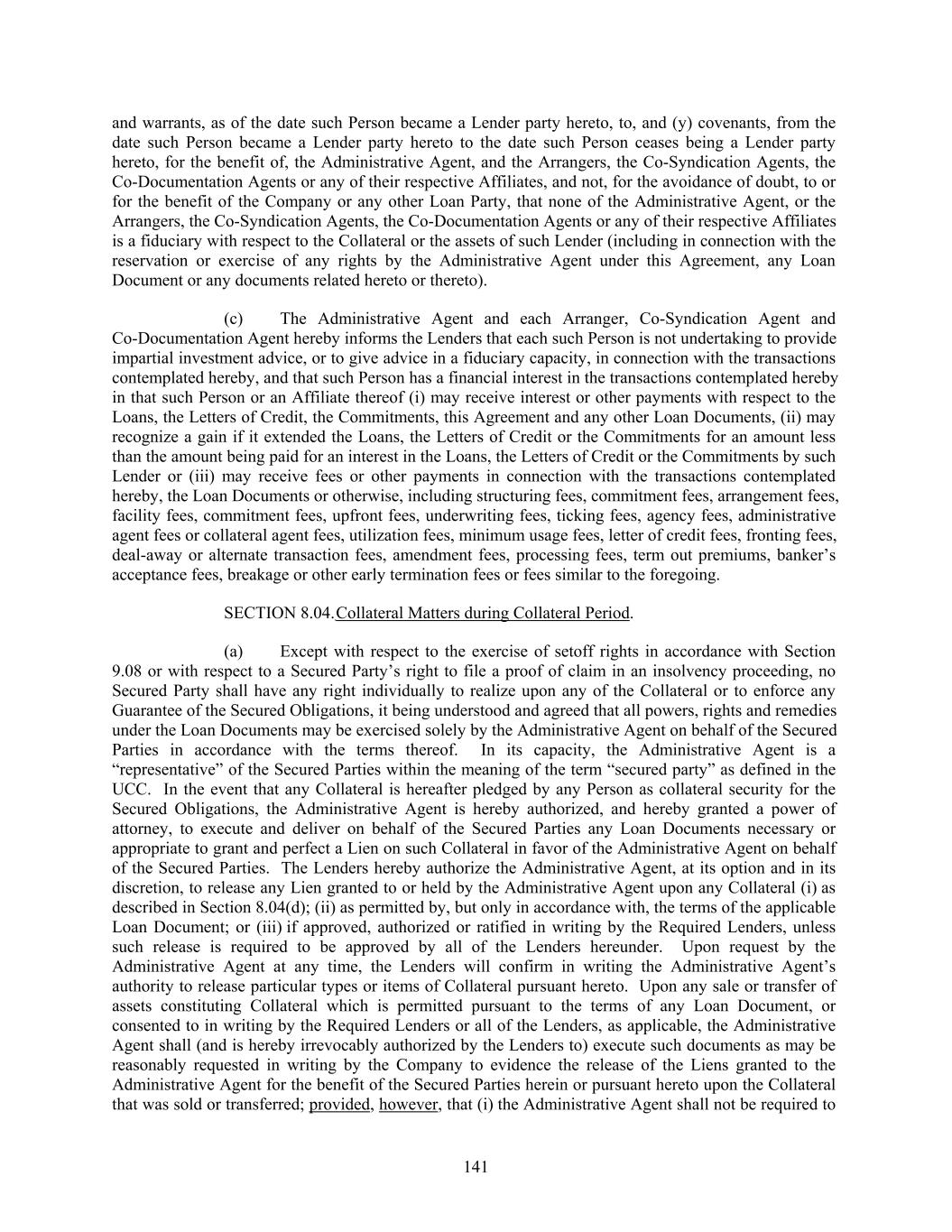 and warrants, as of the date such Person became a Lender party hereto, to, and (y) covenants, from the date such Person became a Lender party hereto to the date such Person ceases being a Lender party hereto, for the benefit of, the Administrative Agent, and the Arrangers, the Co-Syndication Agents, the Co-Documentation Agents or any of their respective Affiliates, and not, for the avoidance of doubt, to or for the benefit of the Company or any other Loan Party, that none of the Administrative Agent, or the Arrangers, the Co-Syndication Agents, the Co-Documentation Agents or any of their respective Affiliates is a fiduciary with respect to the Collateral or the assets of such Lender (including in connection with the reservation or exercise of any rights by the Administrative Agent under this Agreement, any Loan Document or any documents related hereto or thereto). (c) The Administrative Agent and each Arranger, Co-Syndication Agent and Co-Documentation Agent hereby informs the Lenders that each such Person is not undertaking to provide impartial investment advice, or to give advice in a fiduciary capacity, in connection with the transactions contemplated hereby, and that such Person has a financial interest in the transactions contemplated hereby in that such Person or an Affiliate thereof (i) may receive interest or other payments with respect to the Loans, the Letters of Credit, the Commitments, this Agreement and any other Loan Documents, (ii) may recognize a gain if it extended the Loans, the Letters of Credit or the Commitments for an amount less than the amount being paid for an interest in the Loans, the Letters of Credit or the Commitments by such Lender or (iii) may receive fees or other payments in connection with the transactions contemplated hereby, the Loan Documents or otherwise, including structuring fees, commitment fees, arrangement fees, facility fees, commitment fees, upfront fees, underwriting fees, ticking fees, agency fees, administrative agent fees or collateral agent fees, utilization fees, minimum usage fees, letter of credit fees, fronting fees, deal-away or alternate transaction fees, amendment fees, processing fees, term out premiums, banker’s acceptance fees, breakage or other early termination fees or fees similar to the foregoing. SECTION 8.04.Collateral Matters during Collateral Period. (a) Except with respect to the exercise of setoff rights in accordance with Section 9.08 or with respect to a Secured Party’s right to file a proof of claim in an insolvency proceeding, no Secured Party shall have any right individually to realize upon any of the Collateral or to enforce any Guarantee of the Secured Obligations, it being understood and agreed that all powers, rights and remedies under the Loan Documents may be exercised solely by the Administrative Agent on behalf of the Secured Parties in accordance with the terms thereof. In its capacity, the Administrative Agent is a “representative” of the Secured Parties within the meaning of the term “secured party” as defined in the UCC. In the event that any Collateral is hereafter pledged by any Person as collateral security for the Secured Obligations, the Administrative Agent is hereby authorized, and hereby granted a power of attorney, to execute and deliver on behalf of the Secured Parties any Loan Documents necessary or appropriate to grant and perfect a Lien on such Collateral in favor of the Administrative Agent on behalf of the Secured Parties. The Lenders hereby authorize the Administrative Agent, at its option and in its discretion, to release any Lien granted to or held by the Administrative Agent upon any Collateral (i) as described in Section 8.04(d); (ii) as permitted by, but only in accordance with, the terms of the applicable Loan Document; or (iii) if approved, authorized or ratified in writing by the Required Lenders, unless such release is required to be approved by all of the Lenders hereunder. Upon request by the Administrative Agent at any time, the Lenders will confirm in writing the Administrative Agent’s authority to release particular types or items of Collateral pursuant hereto. Upon any sale or transfer of assets constituting Collateral which is permitted pursuant to the terms of any Loan Document, or consented to in writing by the Required Lenders or all of the Lenders, as applicable, the Administrative Agent shall (and is hereby irrevocably authorized by the Lenders to) execute such documents as may be reasonably requested in writing by the Company to evidence the release of the Liens granted to the Administrative Agent for the benefit of the Secured Parties herein or pursuant hereto upon the Collateral that was sold or transferred; provided, however, that (i) the Administrative Agent shall not be required to 141
