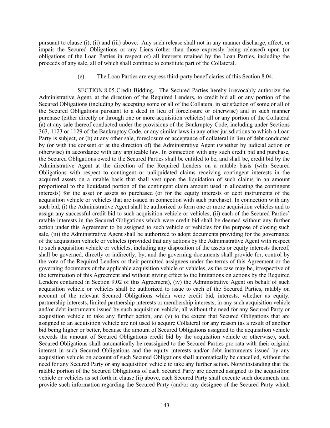 pursuant to clause (i), (ii) and (iii) above. Any such release shall not in any manner discharge, affect, or impair the Secured Obligations or any Liens (other than those expressly being released) upon (or obligations of the Loan Parties in respect of) all interests retained by the Loan Parties, including the proceeds of any sale, all of which shall continue to constitute part of the Collateral. (e) The Loan Parties are express third-party beneficiaries of this Section 8.04. SECTION 8.05.Credit Bidding. The Secured Parties hereby irrevocably authorize the Administrative Agent, at the direction of the Required Lenders, to credit bid all or any portion of the Secured Obligations (including by accepting some or all of the Collateral in satisfaction of some or all of the Secured Obligations pursuant to a deed in lieu of foreclosure or otherwise) and in such manner purchase (either directly or through one or more acquisition vehicles) all or any portion of the Collateral (a) at any sale thereof conducted under the provisions of the Bankruptcy Code, including under Sections 363, 1123 or 1129 of the Bankruptcy Code, or any similar laws in any other jurisdictions to which a Loan Party is subject, or (b) at any other sale, foreclosure or acceptance of collateral in lieu of debt conducted by (or with the consent or at the direction of) the Administrative Agent (whether by judicial action or otherwise) in accordance with any applicable law. In connection with any such credit bid and purchase, the Secured Obligations owed to the Secured Parties shall be entitled to be, and shall be, credit bid by the Administrative Agent at the direction of the Required Lenders on a ratable basis (with Secured Obligations with respect to contingent or unliquidated claims receiving contingent interests in the acquired assets on a ratable basis that shall vest upon the liquidation of such claims in an amount proportional to the liquidated portion of the contingent claim amount used in allocating the contingent interests) for the asset or assets so purchased (or for the equity interests or debt instruments of the acquisition vehicle or vehicles that are issued in connection with such purchase). In connection with any such bid, (i) the Administrative Agent shall be authorized to form one or more acquisition vehicles and to assign any successful credit bid to such acquisition vehicle or vehicles, (ii) each of the Secured Parties’ ratable interests in the Secured Obligations which were credit bid shall be deemed without any further action under this Agreement to be assigned to such vehicle or vehicles for the purpose of closing such sale, (iii) the Administrative Agent shall be authorized to adopt documents providing for the governance of the acquisition vehicle or vehicles (provided that any actions by the Administrative Agent with respect to such acquisition vehicle or vehicles, including any disposition of the assets or equity interests thereof, shall be governed, directly or indirectly, by, and the governing documents shall provide for, control by the vote of the Required Lenders or their permitted assignees under the terms of this Agreement or the governing documents of the applicable acquisition vehicle or vehicles, as the case may be, irrespective of the termination of this Agreement and without giving effect to the limitations on actions by the Required Lenders contained in Section 9.02 of this Agreement), (iv) the Administrative Agent on behalf of such acquisition vehicle or vehicles shall be authorized to issue to each of the Secured Parties, ratably on account of the relevant Secured Obligations which were credit bid, interests, whether as equity, partnership interests, limited partnership interests or membership interests, in any such acquisition vehicle and/or debt instruments issued by such acquisition vehicle, all without the need for any Secured Party or acquisition vehicle to take any further action, and (v) to the extent that Secured Obligations that are assigned to an acquisition vehicle are not used to acquire Collateral for any reason (as a result of another bid being higher or better, because the amount of Secured Obligations assigned to the acquisition vehicle exceeds the amount of Secured Obligations credit bid by the acquisition vehicle or otherwise), such Secured Obligations shall automatically be reassigned to the Secured Parties pro rata with their original interest in such Secured Obligations and the equity interests and/or debt instruments issued by any acquisition vehicle on account of such Secured Obligations shall automatically be cancelled, without the need for any Secured Party or any acquisition vehicle to take any further action. Notwithstanding that the ratable portion of the Secured Obligations of each Secured Party are deemed assigned to the acquisition vehicle or vehicles as set forth in clause (ii) above, each Secured Party shall execute such documents and provide such information regarding the Secured Party (and/or any designee of the Secured Party which 143