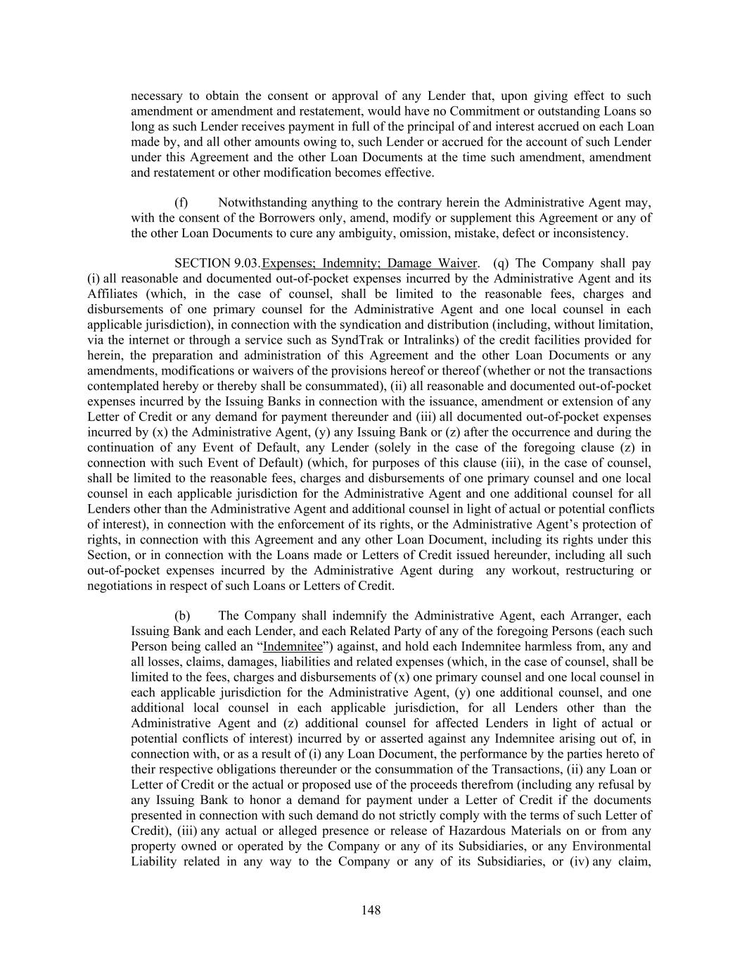 necessary to obtain the consent or approval of any Lender that, upon giving effect to such amendment or amendment and restatement, would have no Commitment or outstanding Loans so long as such Lender receives payment in full of the principal of and interest accrued on each Loan made by, and all other amounts owing to, such Lender or accrued for the account of such Lender under this Agreement and the other Loan Documents at the time such amendment, amendment and restatement or other modification becomes effective. (f) Notwithstanding anything to the contrary herein the Administrative Agent may, with the consent of the Borrowers only, amend, modify or supplement this Agreement or any of the other Loan Documents to cure any ambiguity, omission, mistake, defect or inconsistency. SECTION 9.03.Expenses; Indemnity; Damage Waiver. (q) The Company shall pay (i) all reasonable and documented out-of-pocket expenses incurred by the Administrative Agent and its Affiliates (which, in the case of counsel, shall be limited to the reasonable fees, charges and disbursements of one primary counsel for the Administrative Agent and one local counsel in each applicable jurisdiction), in connection with the syndication and distribution (including, without limitation, via the internet or through a service such as SyndTrak or Intralinks) of the credit facilities provided for herein, the preparation and administration of this Agreement and the other Loan Documents or any amendments, modifications or waivers of the provisions hereof or thereof (whether or not the transactions contemplated hereby or thereby shall be consummated), (ii) all reasonable and documented out-of-pocket expenses incurred by the Issuing Banks in connection with the issuance, amendment or extension of any Letter of Credit or any demand for payment thereunder and (iii) all documented out-of-pocket expenses incurred by (x) the Administrative Agent, (y) any Issuing Bank or (z) after the occurrence and during the continuation of any Event of Default, any Lender (solely in the case of the foregoing clause (z) in connection with such Event of Default) (which, for purposes of this clause (iii), in the case of counsel, shall be limited to the reasonable fees, charges and disbursements of one primary counsel and one local counsel in each applicable jurisdiction for the Administrative Agent and one additional counsel for all Lenders other than the Administrative Agent and additional counsel in light of actual or potential conflicts of interest), in connection with the enforcement of its rights, or the Administrative Agent’s protection of rights, in connection with this Agreement and any other Loan Document, including its rights under this Section, or in connection with the Loans made or Letters of Credit issued hereunder, including all such out-of-pocket expenses incurred by the Administrative Agent during any workout, restructuring or negotiations in respect of such Loans or Letters of Credit. (b) The Company shall indemnify the Administrative Agent, each Arranger, each Issuing Bank and each Lender, and each Related Party of any of the foregoing Persons (each such Person being called an “Indemnitee”) against, and hold each Indemnitee harmless from, any and all losses, claims, damages, liabilities and related expenses (which, in the case of counsel, shall be limited to the fees, charges and disbursements of (x) one primary counsel and one local counsel in each applicable jurisdiction for the Administrative Agent, (y) one additional counsel, and one additional local counsel in each applicable jurisdiction, for all Lenders other than the Administrative Agent and (z) additional counsel for affected Lenders in light of actual or potential conflicts of interest) incurred by or asserted against any Indemnitee arising out of, in connection with, or as a result of (i) any Loan Document, the performance by the parties hereto of their respective obligations thereunder or the consummation of the Transactions, (ii) any Loan or Letter of Credit or the actual or proposed use of the proceeds therefrom (including any refusal by any Issuing Bank to honor a demand for payment under a Letter of Credit if the documents presented in connection with such demand do not strictly comply with the terms of such Letter of Credit), (iii) any actual or alleged presence or release of Hazardous Materials on or from any property owned or operated by the Company or any of its Subsidiaries, or any Environmental Liability related in any way to the Company or any of its Subsidiaries, or (iv) any claim, 148
