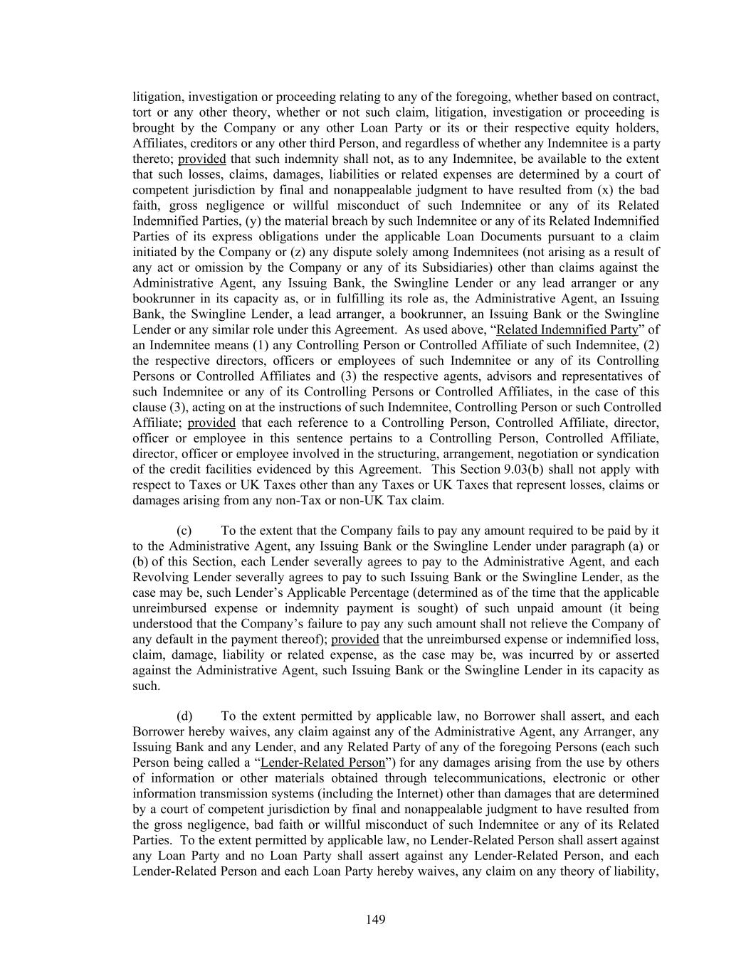 litigation, investigation or proceeding relating to any of the foregoing, whether based on contract, tort or any other theory, whether or not such claim, litigation, investigation or proceeding is brought by the Company or any other Loan Party or its or their respective equity holders, Affiliates, creditors or any other third Person, and regardless of whether any Indemnitee is a party thereto; provided that such indemnity shall not, as to any Indemnitee, be available to the extent that such losses, claims, damages, liabilities or related expenses are determined by a court of competent jurisdiction by final and nonappealable judgment to have resulted from (x) the bad faith, gross negligence or willful misconduct of such Indemnitee or any of its Related Indemnified Parties, (y) the material breach by such Indemnitee or any of its Related Indemnified Parties of its express obligations under the applicable Loan Documents pursuant to a claim initiated by the Company or (z) any dispute solely among Indemnitees (not arising as a result of any act or omission by the Company or any of its Subsidiaries) other than claims against the Administrative Agent, any Issuing Bank, the Swingline Lender or any lead arranger or any bookrunner in its capacity as, or in fulfilling its role as, the Administrative Agent, an Issuing Bank, the Swingline Lender, a lead arranger, a bookrunner, an Issuing Bank or the Swingline Lender or any similar role under this Agreement. As used above, “Related Indemnified Party” of an Indemnitee means (1) any Controlling Person or Controlled Affiliate of such Indemnitee, (2) the respective directors, officers or employees of such Indemnitee or any of its Controlling Persons or Controlled Affiliates and (3) the respective agents, advisors and representatives of such Indemnitee or any of its Controlling Persons or Controlled Affiliates, in the case of this clause (3), acting on at the instructions of such Indemnitee, Controlling Person or such Controlled Affiliate; provided that each reference to a Controlling Person, Controlled Affiliate, director, officer or employee in this sentence pertains to a Controlling Person, Controlled Affiliate, director, officer or employee involved in the structuring, arrangement, negotiation or syndication of the credit facilities evidenced by this Agreement. This Section 9.03(b) shall not apply with respect to Taxes or UK Taxes other than any Taxes or UK Taxes that represent losses, claims or damages arising from any non-Tax or non-UK Tax claim. (c) To the extent that the Company fails to pay any amount required to be paid by it to the Administrative Agent, any Issuing Bank or the Swingline Lender under paragraph (a) or (b) of this Section, each Lender severally agrees to pay to the Administrative Agent, and each Revolving Lender severally agrees to pay to such Issuing Bank or the Swingline Lender, as the case may be, such Lender’s Applicable Percentage (determined as of the time that the applicable unreimbursed expense or indemnity payment is sought) of such unpaid amount (it being understood that the Company’s failure to pay any such amount shall not relieve the Company of any default in the payment thereof); provided that the unreimbursed expense or indemnified loss, claim, damage, liability or related expense, as the case may be, was incurred by or asserted against the Administrative Agent, such Issuing Bank or the Swingline Lender in its capacity as such. (d) To the extent permitted by applicable law, no Borrower shall assert, and each Borrower hereby waives, any claim against any of the Administrative Agent, any Arranger, any Issuing Bank and any Lender, and any Related Party of any of the foregoing Persons (each such Person being called a “Lender-Related Person”) for any damages arising from the use by others of information or other materials obtained through telecommunications, electronic or other information transmission systems (including the Internet) other than damages that are determined by a court of competent jurisdiction by final and nonappealable judgment to have resulted from the gross negligence, bad faith or willful misconduct of such Indemnitee or any of its Related Parties. To the extent permitted by applicable law, no Lender-Related Person shall assert against any Loan Party and no Loan Party shall assert against any Lender-Related Person, and each Lender-Related Person and each Loan Party hereby waives, any claim on any theory of liability, 149