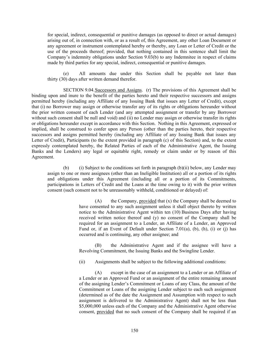 for special, indirect, consequential or punitive damages (as opposed to direct or actual damages) arising out of, in connection with, or as a result of, this Agreement, any other Loan Document or any agreement or instrument contemplated hereby or thereby, any Loan or Letter of Credit or the use of the proceeds thereof; provided, that nothing contained in this sentence shall limit the Company’s indemnity obligations under Section 9.03(b) to any Indemnitee in respect of claims made by third parties for any special, indirect, consequential or punitive damages. (e) All amounts due under this Section shall be payable not later than thirty (30) days after written demand therefor. SECTION 9.04.Successors and Assigns. (r) The provisions of this Agreement shall be binding upon and inure to the benefit of the parties hereto and their respective successors and assigns permitted hereby (including any Affiliate of any Issuing Bank that issues any Letter of Credit), except that (i) no Borrower may assign or otherwise transfer any of its rights or obligations hereunder without the prior written consent of each Lender (and any attempted assignment or transfer by any Borrower without such consent shall be null and void) and (ii) no Lender may assign or otherwise transfer its rights or obligations hereunder except in accordance with this Section. Nothing in this Agreement, expressed or implied, shall be construed to confer upon any Person (other than the parties hereto, their respective successors and assigns permitted hereby (including any Affiliate of any Issuing Bank that issues any Letter of Credit), Participants (to the extent provided in paragraph (c) of this Section) and, to the extent expressly contemplated hereby, the Related Parties of each of the Administrative Agent, the Issuing Banks and the Lenders) any legal or equitable right, remedy or claim under or by reason of this Agreement. (b) (i) Subject to the conditions set forth in paragraph (b)(ii) below, any Lender may assign to one or more assignees (other than an Ineligible Institution) all or a portion of its rights and obligations under this Agreement (including all or a portion of its Commitments, participations in Letters of Credit and the Loans at the time owing to it) with the prior written consent (such consent not to be unreasonably withheld, conditioned or delayed) of: (A) the Company, provided that (x) the Company shall be deemed to have consented to any such assignment unless it shall object thereto by written notice to the Administrative Agent within ten (10) Business Days after having received written notice thereof and (y) no consent of the Company shall be required for an assignment to a Lender, an Affiliate of a Lender, an Approved Fund or, if an Event of Default under Section 7.01(a), (b), (h), (i) or (j) has occurred and is continuing, any other assignee; and (B) the Administrative Agent and if the assignee will have a Revolving Commitment, the Issuing Banks and the Swingline Lender. (ii) Assignments shall be subject to the following additional conditions: (A) except in the case of an assignment to a Lender or an Affiliate of a Lender or an Approved Fund or an assignment of the entire remaining amount of the assigning Lender’s Commitment or Loans of any Class, the amount of the Commitment or Loans of the assigning Lender subject to each such assignment (determined as of the date the Assignment and Assumption with respect to such assignment is delivered to the Administrative Agent) shall not be less than $5,000,000 unless each of the Company and the Administrative Agent otherwise consent, provided that no such consent of the Company shall be required if an 150