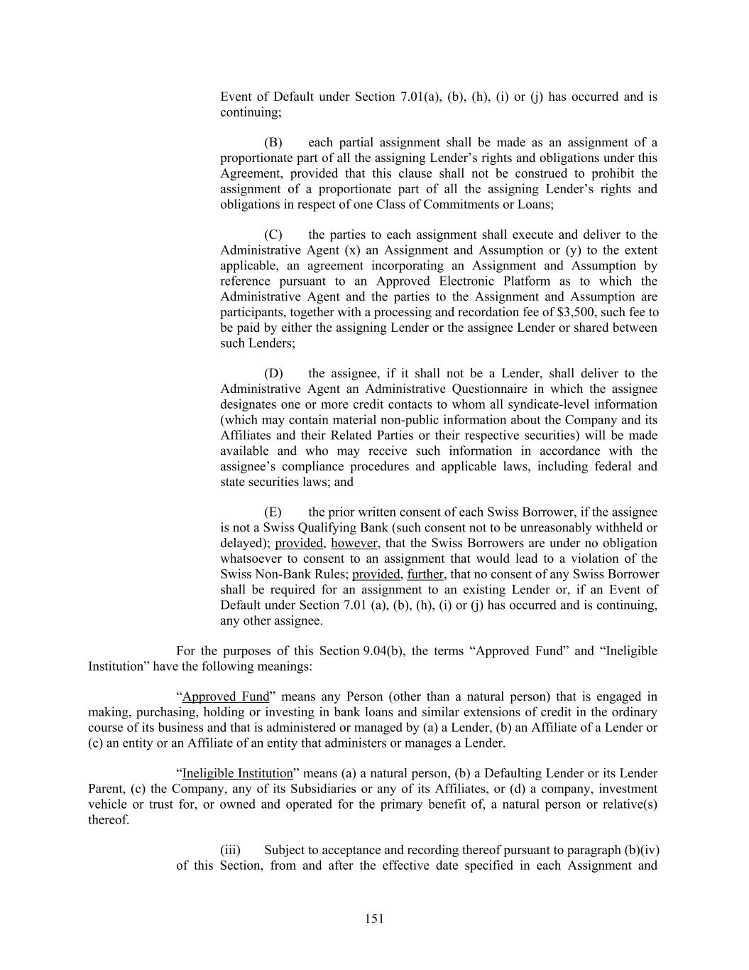 Event of Default under Section 7.01(a), (b), (h), (i) or (j) has occurred and is continuing; (B) each partial assignment shall be made as an assignment of a proportionate part of all the assigning Lender’s rights and obligations under this Agreement, provided that this clause shall not be construed to prohibit the assignment of a proportionate part of all the assigning Lender’s rights and obligations in respect of one Class of Commitments or Loans; (C) the parties to each assignment shall execute and deliver to the Administrative Agent (x) an Assignment and Assumption or (y) to the extent applicable, an agreement incorporating an Assignment and Assumption by reference pursuant to an Approved Electronic Platform as to which the Administrative Agent and the parties to the Assignment and Assumption are participants, together with a processing and recordation fee of $3,500, such fee to be paid by either the assigning Lender or the assignee Lender or shared between such Lenders; (D) the assignee, if it shall not be a Lender, shall deliver to the Administrative Agent an Administrative Questionnaire in which the assignee designates one or more credit contacts to whom all syndicate-level information (which may contain material non-public information about the Company and its Affiliates and their Related Parties or their respective securities) will be made available and who may receive such information in accordance with the assignee’s compliance procedures and applicable laws, including federal and state securities laws; and (E) the prior written consent of each Swiss Borrower, if the assignee is not a Swiss Qualifying Bank (such consent not to be unreasonably withheld or delayed); provided, however, that the Swiss Borrowers are under no obligation whatsoever to consent to an assignment that would lead to a violation of the Swiss Non-Bank Rules; provided, further, that no consent of any Swiss Borrower shall be required for an assignment to an existing Lender or, if an Event of Default under Section 7.01 (a), (b), (h), (i) or (j) has occurred and is continuing, any other assignee. For the purposes of this Section 9.04(b), the terms “Approved Fund” and “Ineligible Institution” have the following meanings: “Approved Fund” means any Person (other than a natural person) that is engaged in making, purchasing, holding or investing in bank loans and similar extensions of credit in the ordinary course of its business and that is administered or managed by (a) a Lender, (b) an Affiliate of a Lender or (c) an entity or an Affiliate of an entity that administers or manages a Lender. “Ineligible Institution” means (a) a natural person, (b) a Defaulting Lender or its Lender Parent, (c) the Company, any of its Subsidiaries or any of its Affiliates, or (d) a company, investment vehicle or trust for, or owned and operated for the primary benefit of, a natural person or relative(s) thereof. (iii) Subject to acceptance and recording thereof pursuant to paragraph (b)(iv) of this Section, from and after the effective date specified in each Assignment and 151