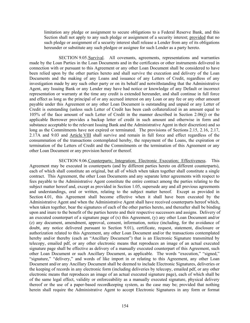limitation any pledge or assignment to secure obligations to a Federal Reserve Bank, and this Section shall not apply to any such pledge or assignment of a security interest; provided that no such pledge or assignment of a security interest shall release a Lender from any of its obligations hereunder or substitute any such pledgee or assignee for such Lender as a party hereto. SECTION 9.05.Survival. All covenants, agreements, representations and warranties made by the Loan Parties in the Loan Documents and in the certificates or other instruments delivered in connection with or pursuant to this Agreement or any other Loan Document shall be considered to have been relied upon by the other parties hereto and shall survive the execution and delivery of the Loan Documents and the making of any Loans and issuance of any Letters of Credit, regardless of any investigation made by any such other party or on its behalf and notwithstanding that the Administrative Agent, any Issuing Bank or any Lender may have had notice or knowledge of any Default or incorrect representation or warranty at the time any credit is extended hereunder, and shall continue in full force and effect as long as the principal of or any accrued interest on any Loan or any fee or any other amount payable under this Agreement or any other Loan Document is outstanding and unpaid or any Letter of Credit is outstanding (unless such Letter of Credit has been cash collateralized in an amount equal to 105% of the face amount of such Letter of Credit in the manner described in Section 2.06(j) or the applicable Borrower provides a backup letter of credit in such amount and otherwise in form and substance acceptable to the relevant Issuing Bank and the Administrative Agent in their discretion) and so long as the Commitments have not expired or terminated. The provisions of Sections 2.15, 2.16, 2.17, 2.17A and 9.03 and Article VIII shall survive and remain in full force and effect regardless of the consummation of the transactions contemplated hereby, the repayment of the Loans, the expiration or termination of the Letters of Credit and the Commitments or the termination of this Agreement or any other Loan Document or any provision hereof or thereof. SECTION 9.06.Counterparts; Integration; Electronic Execution; Effectiveness. This Agreement may be executed in counterparts (and by different parties hereto on different counterparts), each of which shall constitute an original, but all of which when taken together shall constitute a single contract. This Agreement, the other Loan Documents and any separate letter agreements with respect to fees payable to the Administrative Agent constitute the entire contract among the parties relating to the subject matter hereof and, except as provided in Section 1.05, supersede any and all previous agreements and understandings, oral or written, relating to the subject matter hereof. Except as provided in Section 4.01, this Agreement shall become effective when it shall have been executed by the Administrative Agent and when the Administrative Agent shall have received counterparts hereof which, when taken together, bear the signatures of each of the other parties hereto, and thereafter shall be binding upon and inure to the benefit of the parties hereto and their respective successors and assigns. Delivery of an executed counterpart of a signature page of (x) this Agreement, (y) any other Loan Document and/or (z) any document, amendment, approval, consent, information, notice (including, for the avoidance of doubt, any notice delivered pursuant to Section 9.01), certificate, request, statement, disclosure or authorization related to this Agreement, any other Loan Document and/or the transactions contemplated hereby and/or thereby (each an “Ancillary Document”) that is an Electronic Signature transmitted by telecopy, emailed pdf, or any other electronic means that reproduces an image of an actual executed signature page shall be effective as delivery of a manually executed counterpart of this Agreement, such other Loan Document or such Ancillary Document, as applicable. The words “execution,” “signed,” “signature,” “delivery,” and words of like import in or relating to this Agreement, any other Loan Document and/or any Ancillary Document shall be deemed to include Electronic Signatures, deliveries or the keeping of records in any electronic form (including deliveries by telecopy, emailed pdf, or any other electronic means that reproduces an image of an actual executed signature page), each of which shall be of the same legal effect, validity or enforceability as a manually executed signature, physical delivery thereof or the use of a paper-based recordkeeping system, as the case may be; provided that nothing herein shall require the Administrative Agent to accept Electronic Signatures in any form or format 154