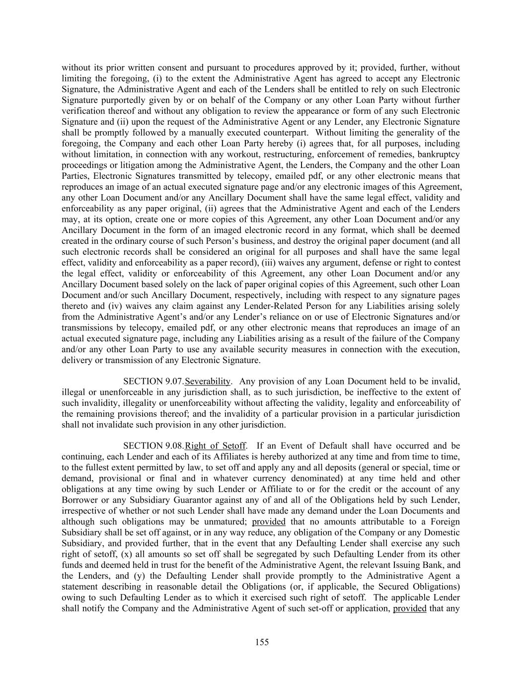 without its prior written consent and pursuant to procedures approved by it; provided, further, without limiting the foregoing, (i) to the extent the Administrative Agent has agreed to accept any Electronic Signature, the Administrative Agent and each of the Lenders shall be entitled to rely on such Electronic Signature purportedly given by or on behalf of the Company or any other Loan Party without further verification thereof and without any obligation to review the appearance or form of any such Electronic Signature and (ii) upon the request of the Administrative Agent or any Lender, any Electronic Signature shall be promptly followed by a manually executed counterpart. Without limiting the generality of the foregoing, the Company and each other Loan Party hereby (i) agrees that, for all purposes, including without limitation, in connection with any workout, restructuring, enforcement of remedies, bankruptcy proceedings or litigation among the Administrative Agent, the Lenders, the Company and the other Loan Parties, Electronic Signatures transmitted by telecopy, emailed pdf, or any other electronic means that reproduces an image of an actual executed signature page and/or any electronic images of this Agreement, any other Loan Document and/or any Ancillary Document shall have the same legal effect, validity and enforceability as any paper original, (ii) agrees that the Administrative Agent and each of the Lenders may, at its option, create one or more copies of this Agreement, any other Loan Document and/or any Ancillary Document in the form of an imaged electronic record in any format, which shall be deemed created in the ordinary course of such Person’s business, and destroy the original paper document (and all such electronic records shall be considered an original for all purposes and shall have the same legal effect, validity and enforceability as a paper record), (iii) waives any argument, defense or right to contest the legal effect, validity or enforceability of this Agreement, any other Loan Document and/or any Ancillary Document based solely on the lack of paper original copies of this Agreement, such other Loan Document and/or such Ancillary Document, respectively, including with respect to any signature pages thereto and (iv) waives any claim against any Lender-Related Person for any Liabilities arising solely from the Administrative Agent’s and/or any Lender’s reliance on or use of Electronic Signatures and/or transmissions by telecopy, emailed pdf, or any other electronic means that reproduces an image of an actual executed signature page, including any Liabilities arising as a result of the failure of the Company and/or any other Loan Party to use any available security measures in connection with the execution, delivery or transmission of any Electronic Signature. SECTION 9.07.Severability. Any provision of any Loan Document held to be invalid, illegal or unenforceable in any jurisdiction shall, as to such jurisdiction, be ineffective to the extent of such invalidity, illegality or unenforceability without affecting the validity, legality and enforceability of the remaining provisions thereof; and the invalidity of a particular provision in a particular jurisdiction shall not invalidate such provision in any other jurisdiction. SECTION 9.08.Right of Setoff. If an Event of Default shall have occurred and be continuing, each Lender and each of its Affiliates is hereby authorized at any time and from time to time, to the fullest extent permitted by law, to set off and apply any and all deposits (general or special, time or demand, provisional or final and in whatever currency denominated) at any time held and other obligations at any time owing by such Lender or Affiliate to or for the credit or the account of any Borrower or any Subsidiary Guarantor against any of and all of the Obligations held by such Lender, irrespective of whether or not such Lender shall have made any demand under the Loan Documents and although such obligations may be unmatured; provided that no amounts attributable to a Foreign Subsidiary shall be set off against, or in any way reduce, any obligation of the Company or any Domestic Subsidiary, and provided further, that in the event that any Defaulting Lender shall exercise any such right of setoff, (x) all amounts so set off shall be segregated by such Defaulting Lender from its other funds and deemed held in trust for the benefit of the Administrative Agent, the relevant Issuing Bank, and the Lenders, and (y) the Defaulting Lender shall provide promptly to the Administrative Agent a statement describing in reasonable detail the Obligations (or, if applicable, the Secured Obligations) owing to such Defaulting Lender as to which it exercised such right of setoff. The applicable Lender shall notify the Company and the Administrative Agent of such set-off or application, provided that any 155