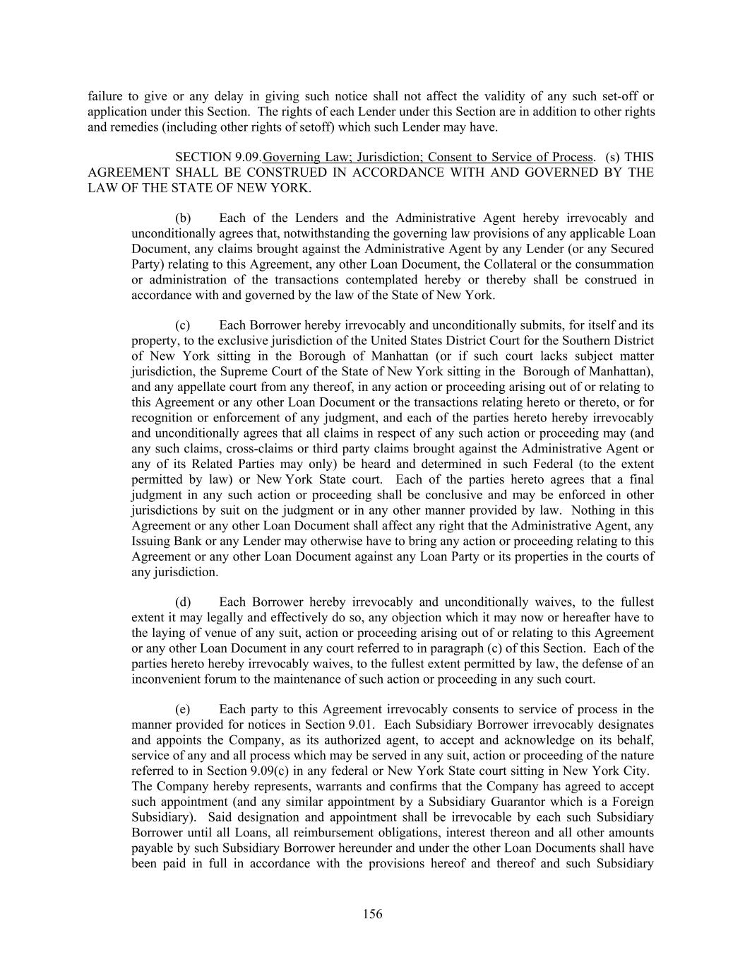 failure to give or any delay in giving such notice shall not affect the validity of any such set-off or application under this Section. The rights of each Lender under this Section are in addition to other rights and remedies (including other rights of setoff) which such Lender may have. SECTION 9.09.Governing Law; Jurisdiction; Consent to Service of Process. (s) THIS AGREEMENT SHALL BE CONSTRUED IN ACCORDANCE WITH AND GOVERNED BY THE LAW OF THE STATE OF NEW YORK. (b) Each of the Lenders and the Administrative Agent hereby irrevocably and unconditionally agrees that, notwithstanding the governing law provisions of any applicable Loan Document, any claims brought against the Administrative Agent by any Lender (or any Secured Party) relating to this Agreement, any other Loan Document, the Collateral or the consummation or administration of the transactions contemplated hereby or thereby shall be construed in accordance with and governed by the law of the State of New York. (c) Each Borrower hereby irrevocably and unconditionally submits, for itself and its property, to the exclusive jurisdiction of the United States District Court for the Southern District of New York sitting in the Borough of Manhattan (or if such court lacks subject matter jurisdiction, the Supreme Court of the State of New York sitting in the Borough of Manhattan), and any appellate court from any thereof, in any action or proceeding arising out of or relating to this Agreement or any other Loan Document or the transactions relating hereto or thereto, or for recognition or enforcement of any judgment, and each of the parties hereto hereby irrevocably and unconditionally agrees that all claims in respect of any such action or proceeding may (and any such claims, cross-claims or third party claims brought against the Administrative Agent or any of its Related Parties may only) be heard and determined in such Federal (to the extent permitted by law) or New York State court. Each of the parties hereto agrees that a final judgment in any such action or proceeding shall be conclusive and may be enforced in other jurisdictions by suit on the judgment or in any other manner provided by law. Nothing in this Agreement or any other Loan Document shall affect any right that the Administrative Agent, any Issuing Bank or any Lender may otherwise have to bring any action or proceeding relating to this Agreement or any other Loan Document against any Loan Party or its properties in the courts of any jurisdiction. (d) Each Borrower hereby irrevocably and unconditionally waives, to the fullest extent it may legally and effectively do so, any objection which it may now or hereafter have to the laying of venue of any suit, action or proceeding arising out of or relating to this Agreement or any other Loan Document in any court referred to in paragraph (c) of this Section. Each of the parties hereto hereby irrevocably waives, to the fullest extent permitted by law, the defense of an inconvenient forum to the maintenance of such action or proceeding in any such court. (e) Each party to this Agreement irrevocably consents to service of process in the manner provided for notices in Section 9.01. Each Subsidiary Borrower irrevocably designates and appoints the Company, as its authorized agent, to accept and acknowledge on its behalf, service of any and all process which may be served in any suit, action or proceeding of the nature referred to in Section 9.09(c) in any federal or New York State court sitting in New York City. The Company hereby represents, warrants and confirms that the Company has agreed to accept such appointment (and any similar appointment by a Subsidiary Guarantor which is a Foreign Subsidiary). Said designation and appointment shall be irrevocable by each such Subsidiary Borrower until all Loans, all reimbursement obligations, interest thereon and all other amounts payable by such Subsidiary Borrower hereunder and under the other Loan Documents shall have been paid in full in accordance with the provisions hereof and thereof and such Subsidiary 156