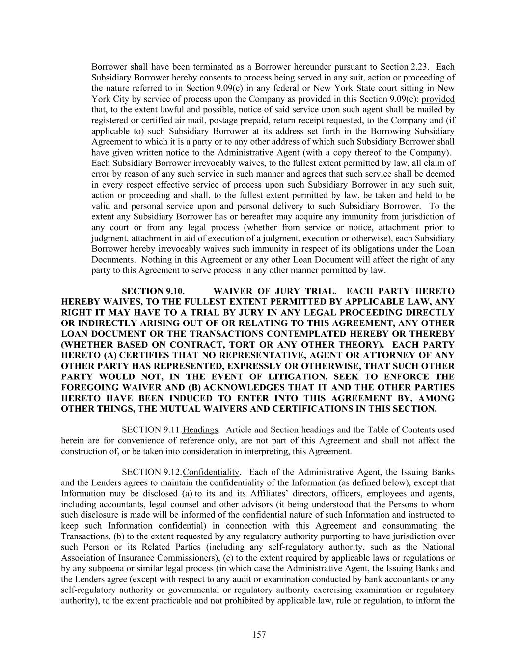 Borrower shall have been terminated as a Borrower hereunder pursuant to Section 2.23. Each Subsidiary Borrower hereby consents to process being served in any suit, action or proceeding of the nature referred to in Section 9.09(c) in any federal or New York State court sitting in New York City by service of process upon the Company as provided in this Section 9.09(e); provided that, to the extent lawful and possible, notice of said service upon such agent shall be mailed by registered or certified air mail, postage prepaid, return receipt requested, to the Company and (if applicable to) such Subsidiary Borrower at its address set forth in the Borrowing Subsidiary Agreement to which it is a party or to any other address of which such Subsidiary Borrower shall have given written notice to the Administrative Agent (with a copy thereof to the Company). Each Subsidiary Borrower irrevocably waives, to the fullest extent permitted by law, all claim of error by reason of any such service in such manner and agrees that such service shall be deemed in every respect effective service of process upon such Subsidiary Borrower in any such suit, action or proceeding and shall, to the fullest extent permitted by law, be taken and held to be valid and personal service upon and personal delivery to such Subsidiary Borrower. To the extent any Subsidiary Borrower has or hereafter may acquire any immunity from jurisdiction of any court or from any legal process (whether from service or notice, attachment prior to judgment, attachment in aid of execution of a judgment, execution or otherwise), each Subsidiary Borrower hereby irrevocably waives such immunity in respect of its obligations under the Loan Documents. Nothing in this Agreement or any other Loan Document will affect the right of any party to this Agreement to serve process in any other manner permitted by law. SECTION 9.10. WAIVER OF JURY TRIAL. EACH PARTY HERETO HEREBY WAIVES, TO THE FULLEST EXTENT PERMITTED BY APPLICABLE LAW, ANY RIGHT IT MAY HAVE TO A TRIAL BY JURY IN ANY LEGAL PROCEEDING DIRECTLY OR INDIRECTLY ARISING OUT OF OR RELATING TO THIS AGREEMENT, ANY OTHER LOAN DOCUMENT OR THE TRANSACTIONS CONTEMPLATED HEREBY OR THEREBY (WHETHER BASED ON CONTRACT, TORT OR ANY OTHER THEORY). EACH PARTY HERETO (A) CERTIFIES THAT NO REPRESENTATIVE, AGENT OR ATTORNEY OF ANY OTHER PARTY HAS REPRESENTED, EXPRESSLY OR OTHERWISE, THAT SUCH OTHER PARTY WOULD NOT, IN THE EVENT OF LITIGATION, SEEK TO ENFORCE THE FOREGOING WAIVER AND (B) ACKNOWLEDGES THAT IT AND THE OTHER PARTIES HERETO HAVE BEEN INDUCED TO ENTER INTO THIS AGREEMENT BY, AMONG OTHER THINGS, THE MUTUAL WAIVERS AND CERTIFICATIONS IN THIS SECTION. SECTION 9.11.Headings. Article and Section headings and the Table of Contents used herein are for convenience of reference only, are not part of this Agreement and shall not affect the construction of, or be taken into consideration in interpreting, this Agreement. SECTION 9.12.Confidentiality. Each of the Administrative Agent, the Issuing Banks and the Lenders agrees to maintain the confidentiality of the Information (as defined below), except that Information may be disclosed (a) to its and its Affiliates’ directors, officers, employees and agents, including accountants, legal counsel and other advisors (it being understood that the Persons to whom such disclosure is made will be informed of the confidential nature of such Information and instructed to keep such Information confidential) in connection with this Agreement and consummating the Transactions, (b) to the extent requested by any regulatory authority purporting to have jurisdiction over such Person or its Related Parties (including any self-regulatory authority, such as the National Association of Insurance Commissioners), (c) to the extent required by applicable laws or regulations or by any subpoena or similar legal process (in which case the Administrative Agent, the Issuing Banks and the Lenders agree (except with respect to any audit or examination conducted by bank accountants or any self-regulatory authority or governmental or regulatory authority exercising examination or regulatory authority), to the extent practicable and not prohibited by applicable law, rule or regulation, to inform the 157