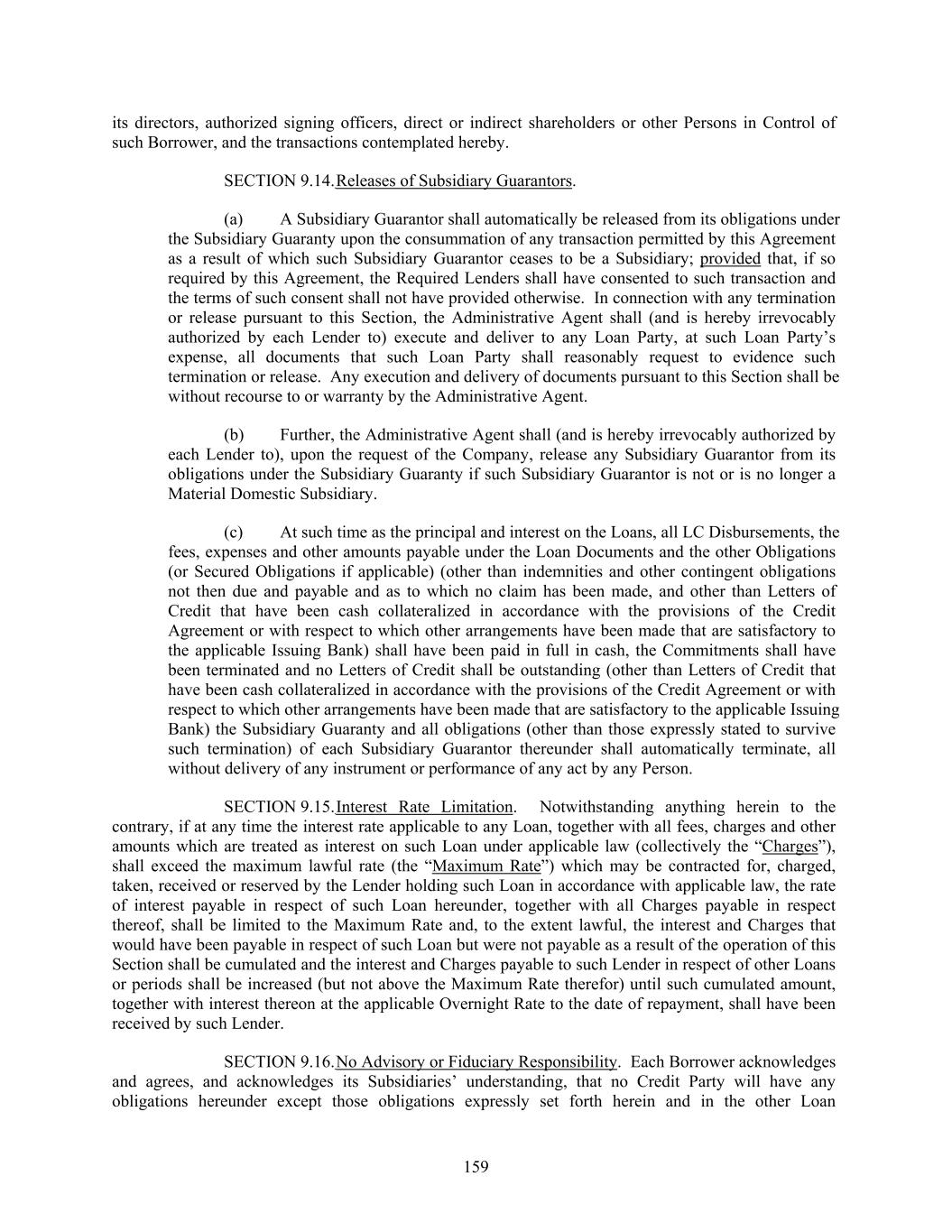 its directors, authorized signing officers, direct or indirect shareholders or other Persons in Control of such Borrower, and the transactions contemplated hereby. SECTION 9.14.Releases of Subsidiary Guarantors. (a) A Subsidiary Guarantor shall automatically be released from its obligations under the Subsidiary Guaranty upon the consummation of any transaction permitted by this Agreement as a result of which such Subsidiary Guarantor ceases to be a Subsidiary; provided that, if so required by this Agreement, the Required Lenders shall have consented to such transaction and the terms of such consent shall not have provided otherwise. In connection with any termination or release pursuant to this Section, the Administrative Agent shall (and is hereby irrevocably authorized by each Lender to) execute and deliver to any Loan Party, at such Loan Party’s expense, all documents that such Loan Party shall reasonably request to evidence such termination or release. Any execution and delivery of documents pursuant to this Section shall be without recourse to or warranty by the Administrative Agent. (b) Further, the Administrative Agent shall (and is hereby irrevocably authorized by each Lender to), upon the request of the Company, release any Subsidiary Guarantor from its obligations under the Subsidiary Guaranty if such Subsidiary Guarantor is not or is no longer a Material Domestic Subsidiary. (c) At such time as the principal and interest on the Loans, all LC Disbursements, the fees, expenses and other amounts payable under the Loan Documents and the other Obligations (or Secured Obligations if applicable) (other than indemnities and other contingent obligations not then due and payable and as to which no claim has been made, and other than Letters of Credit that have been cash collateralized in accordance with the provisions of the Credit Agreement or with respect to which other arrangements have been made that are satisfactory to the applicable Issuing Bank) shall have been paid in full in cash, the Commitments shall have been terminated and no Letters of Credit shall be outstanding (other than Letters of Credit that have been cash collateralized in accordance with the provisions of the Credit Agreement or with respect to which other arrangements have been made that are satisfactory to the applicable Issuing Bank) the Subsidiary Guaranty and all obligations (other than those expressly stated to survive such termination) of each Subsidiary Guarantor thereunder shall automatically terminate, all without delivery of any instrument or performance of any act by any Person. SECTION 9.15.Interest Rate Limitation. Notwithstanding anything herein to the contrary, if at any time the interest rate applicable to any Loan, together with all fees, charges and other amounts which are treated as interest on such Loan under applicable law (collectively the “Charges”), shall exceed the maximum lawful rate (the “Maximum Rate”) which may be contracted for, charged, taken, received or reserved by the Lender holding such Loan in accordance with applicable law, the rate of interest payable in respect of such Loan hereunder, together with all Charges payable in respect thereof, shall be limited to the Maximum Rate and, to the extent lawful, the interest and Charges that would have been payable in respect of such Loan but were not payable as a result of the operation of this Section shall be cumulated and the interest and Charges payable to such Lender in respect of other Loans or periods shall be increased (but not above the Maximum Rate therefor) until such cumulated amount, together with interest thereon at the applicable Overnight Rate to the date of repayment, shall have been received by such Lender. SECTION 9.16.No Advisory or Fiduciary Responsibility. Each Borrower acknowledges and agrees, and acknowledges its Subsidiaries’ understanding, that no Credit Party will have any obligations hereunder except those obligations expressly set forth herein and in the other Loan 159