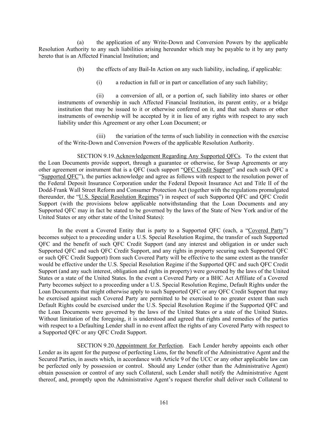 (a) the application of any Write-Down and Conversion Powers by the applicable Resolution Authority to any such liabilities arising hereunder which may be payable to it by any party hereto that is an Affected Financial Institution; and (b) the effects of any Bail-In Action on any such liability, including, if applicable: (i) a reduction in full or in part or cancellation of any such liability; (ii) a conversion of all, or a portion of, such liability into shares or other instruments of ownership in such Affected Financial Institution, its parent entity, or a bridge institution that may be issued to it or otherwise conferred on it, and that such shares or other instruments of ownership will be accepted by it in lieu of any rights with respect to any such liability under this Agreement or any other Loan Document; or (iii) the variation of the terms of such liability in connection with the exercise of the Write-Down and Conversion Powers of the applicable Resolution Authority. SECTION 9.19.Acknowledgement Regarding Any Supported QFCs. To the extent that the Loan Documents provide support, through a guarantee or otherwise, for Swap Agreements or any other agreement or instrument that is a QFC (such support “QFC Credit Support” and each such QFC a “Supported QFC”), the parties acknowledge and agree as follows with respect to the resolution power of the Federal Deposit Insurance Corporation under the Federal Deposit Insurance Act and Title II of the Dodd-Frank Wall Street Reform and Consumer Protection Act (together with the regulations promulgated thereunder, the “U.S. Special Resolution Regimes”) in respect of such Supported QFC and QFC Credit Support (with the provisions below applicable notwithstanding that the Loan Documents and any Supported QFC may in fact be stated to be governed by the laws of the State of New York and/or of the United States or any other state of the United States): In the event a Covered Entity that is party to a Supported QFC (each, a “Covered Party”) becomes subject to a proceeding under a U.S. Special Resolution Regime, the transfer of such Supported QFC and the benefit of such QFC Credit Support (and any interest and obligation in or under such Supported QFC and such QFC Credit Support, and any rights in property securing such Supported QFC or such QFC Credit Support) from such Covered Party will be effective to the same extent as the transfer would be effective under the U.S. Special Resolution Regime if the Supported QFC and such QFC Credit Support (and any such interest, obligation and rights in property) were governed by the laws of the United States or a state of the United States. In the event a Covered Party or a BHC Act Affiliate of a Covered Party becomes subject to a proceeding under a U.S. Special Resolution Regime, Default Rights under the Loan Documents that might otherwise apply to such Supported QFC or any QFC Credit Support that may be exercised against such Covered Party are permitted to be exercised to no greater extent than such Default Rights could be exercised under the U.S. Special Resolution Regime if the Supported QFC and the Loan Documents were governed by the laws of the United States or a state of the United States. Without limitation of the foregoing, it is understood and agreed that rights and remedies of the parties with respect to a Defaulting Lender shall in no event affect the rights of any Covered Party with respect to a Supported QFC or any QFC Credit Support. SECTION 9.20.Appointment for Perfection. Each Lender hereby appoints each other Lender as its agent for the purpose of perfecting Liens, for the benefit of the Administrative Agent and the Secured Parties, in assets which, in accordance with Article 9 of the UCC or any other applicable law can be perfected only by possession or control. Should any Lender (other than the Administrative Agent) obtain possession or control of any such Collateral, such Lender shall notify the Administrative Agent thereof, and, promptly upon the Administrative Agent’s request therefor shall deliver such Collateral to 161