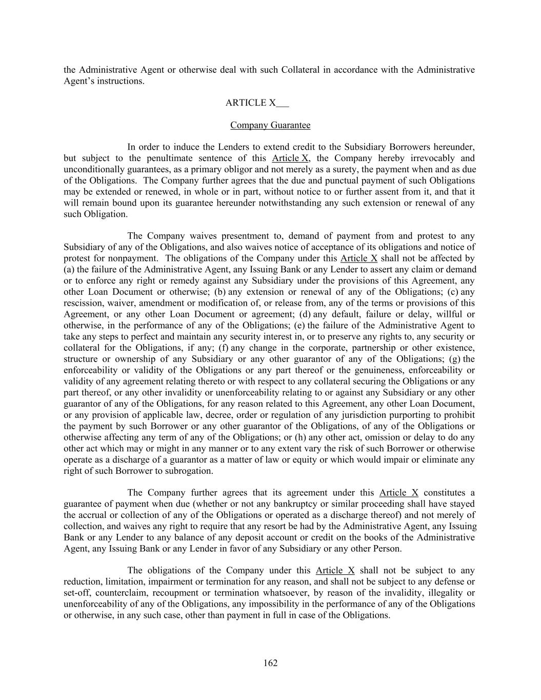 the Administrative Agent or otherwise deal with such Collateral in accordance with the Administrative Agent’s instructions. ARTICLE X Company Guarantee In order to induce the Lenders to extend credit to the Subsidiary Borrowers hereunder, but subject to the penultimate sentence of this Article X, the Company hereby irrevocably and unconditionally guarantees, as a primary obligor and not merely as a surety, the payment when and as due of the Obligations. The Company further agrees that the due and punctual payment of such Obligations may be extended or renewed, in whole or in part, without notice to or further assent from it, and that it will remain bound upon its guarantee hereunder notwithstanding any such extension or renewal of any such Obligation. The Company waives presentment to, demand of payment from and protest to any Subsidiary of any of the Obligations, and also waives notice of acceptance of its obligations and notice of protest for nonpayment. The obligations of the Company under this Article X shall not be affected by (a) the failure of the Administrative Agent, any Issuing Bank or any Lender to assert any claim or demand or to enforce any right or remedy against any Subsidiary under the provisions of this Agreement, any other Loan Document or otherwise; (b) any extension or renewal of any of the Obligations; (c) any rescission, waiver, amendment or modification of, or release from, any of the terms or provisions of this Agreement, or any other Loan Document or agreement; (d) any default, failure or delay, willful or otherwise, in the performance of any of the Obligations; (e) the failure of the Administrative Agent to take any steps to perfect and maintain any security interest in, or to preserve any rights to, any security or collateral for the Obligations, if any; (f) any change in the corporate, partnership or other existence, structure or ownership of any Subsidiary or any other guarantor of any of the Obligations; (g) the enforceability or validity of the Obligations or any part thereof or the genuineness, enforceability or validity of any agreement relating thereto or with respect to any collateral securing the Obligations or any part thereof, or any other invalidity or unenforceability relating to or against any Subsidiary or any other guarantor of any of the Obligations, for any reason related to this Agreement, any other Loan Document, or any provision of applicable law, decree, order or regulation of any jurisdiction purporting to prohibit the payment by such Borrower or any other guarantor of the Obligations, of any of the Obligations or otherwise affecting any term of any of the Obligations; or (h) any other act, omission or delay to do any other act which may or might in any manner or to any extent vary the risk of such Borrower or otherwise operate as a discharge of a guarantor as a matter of law or equity or which would impair or eliminate any right of such Borrower to subrogation. The Company further agrees that its agreement under this Article X constitutes a guarantee of payment when due (whether or not any bankruptcy or similar proceeding shall have stayed the accrual or collection of any of the Obligations or operated as a discharge thereof) and not merely of collection, and waives any right to require that any resort be had by the Administrative Agent, any Issuing Bank or any Lender to any balance of any deposit account or credit on the books of the Administrative Agent, any Issuing Bank or any Lender in favor of any Subsidiary or any other Person. The obligations of the Company under this Article X shall not be subject to any reduction, limitation, impairment or termination for any reason, and shall not be subject to any defense or set-off, counterclaim, recoupment or termination whatsoever, by reason of the invalidity, illegality or unenforceability of any of the Obligations, any impossibility in the performance of any of the Obligations or otherwise, in any such case, other than payment in full in case of the Obligations. 162
