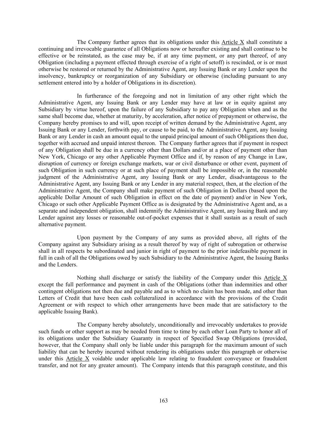 The Company further agrees that its obligations under this Article X shall constitute a continuing and irrevocable guarantee of all Obligations now or hereafter existing and shall continue to be effective or be reinstated, as the case may be, if at any time payment, or any part thereof, of any Obligation (including a payment effected through exercise of a right of setoff) is rescinded, or is or must otherwise be restored or returned by the Administrative Agent, any Issuing Bank or any Lender upon the insolvency, bankruptcy or reorganization of any Subsidiary or otherwise (including pursuant to any settlement entered into by a holder of Obligations in its discretion). In furtherance of the foregoing and not in limitation of any other right which the Administrative Agent, any Issuing Bank or any Lender may have at law or in equity against any Subsidiary by virtue hereof, upon the failure of any Subsidiary to pay any Obligation when and as the same shall become due, whether at maturity, by acceleration, after notice of prepayment or otherwise, the Company hereby promises to and will, upon receipt of written demand by the Administrative Agent, any Issuing Bank or any Lender, forthwith pay, or cause to be paid, to the Administrative Agent, any Issuing Bank or any Lender in cash an amount equal to the unpaid principal amount of such Obligations then due, together with accrued and unpaid interest thereon. The Company further agrees that if payment in respect of any Obligation shall be due in a currency other than Dollars and/or at a place of payment other than New York, Chicago or any other Applicable Payment Office and if, by reason of any Change in Law, disruption of currency or foreign exchange markets, war or civil disturbance or other event, payment of such Obligation in such currency or at such place of payment shall be impossible or, in the reasonable judgment of the Administrative Agent, any Issuing Bank or any Lender, disadvantageous to the Administrative Agent, any Issuing Bank or any Lender in any material respect, then, at the election of the Administrative Agent, the Company shall make payment of such Obligation in Dollars (based upon the applicable Dollar Amount of such Obligation in effect on the date of payment) and/or in New York, Chicago or such other Applicable Payment Office as is designated by the Administrative Agent and, as a separate and independent obligation, shall indemnify the Administrative Agent, any Issuing Bank and any Lender against any losses or reasonable out-of-pocket expenses that it shall sustain as a result of such alternative payment. Upon payment by the Company of any sums as provided above, all rights of the Company against any Subsidiary arising as a result thereof by way of right of subrogation or otherwise shall in all respects be subordinated and junior in right of payment to the prior indefeasible payment in full in cash of all the Obligations owed by such Subsidiary to the Administrative Agent, the Issuing Banks and the Lenders. Nothing shall discharge or satisfy the liability of the Company under this Article X except the full performance and payment in cash of the Obligations (other than indemnities and other contingent obligations not then due and payable and as to which no claim has been made, and other than Letters of Credit that have been cash collateralized in accordance with the provisions of the Credit Agreement or with respect to which other arrangements have been made that are satisfactory to the applicable Issuing Bank). The Company hereby absolutely, unconditionally and irrevocably undertakes to provide such funds or other support as may be needed from time to time by each other Loan Party to honor all of its obligations under the Subsidiary Guaranty in respect of Specified Swap Obligations (provided, however, that the Company shall only be liable under this paragraph for the maximum amount of such liability that can be hereby incurred without rendering its obligations under this paragraph or otherwise under this Article X voidable under applicable law relating to fraudulent conveyance or fraudulent transfer, and not for any greater amount). The Company intends that this paragraph constitute, and this 163